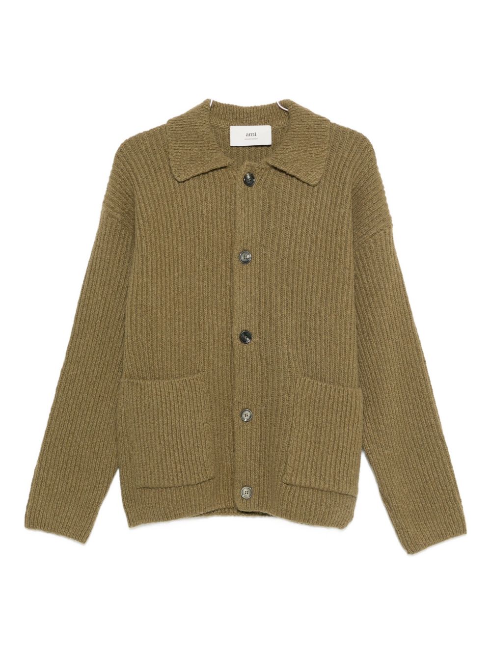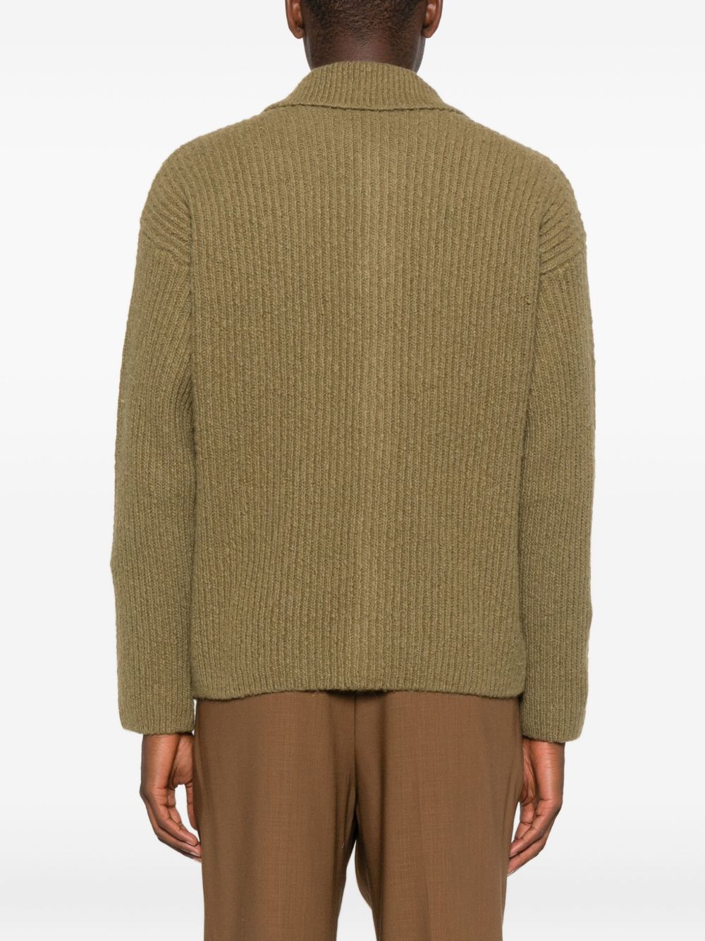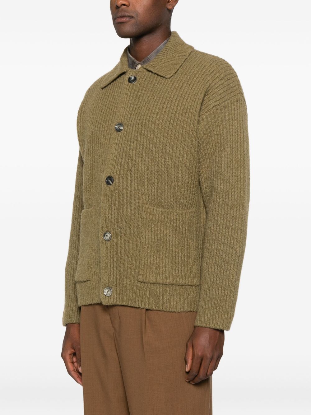 green ribbed knit point collar front button fastening two front patch pockets long sleeves