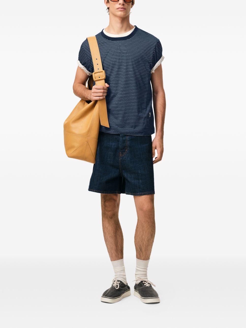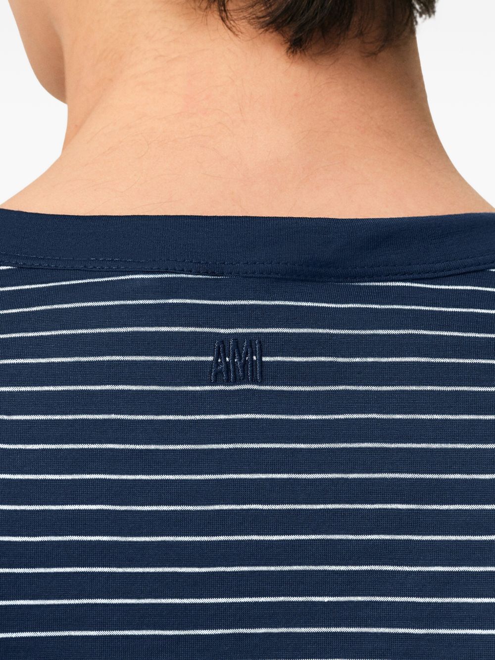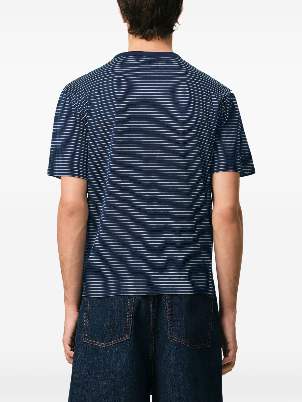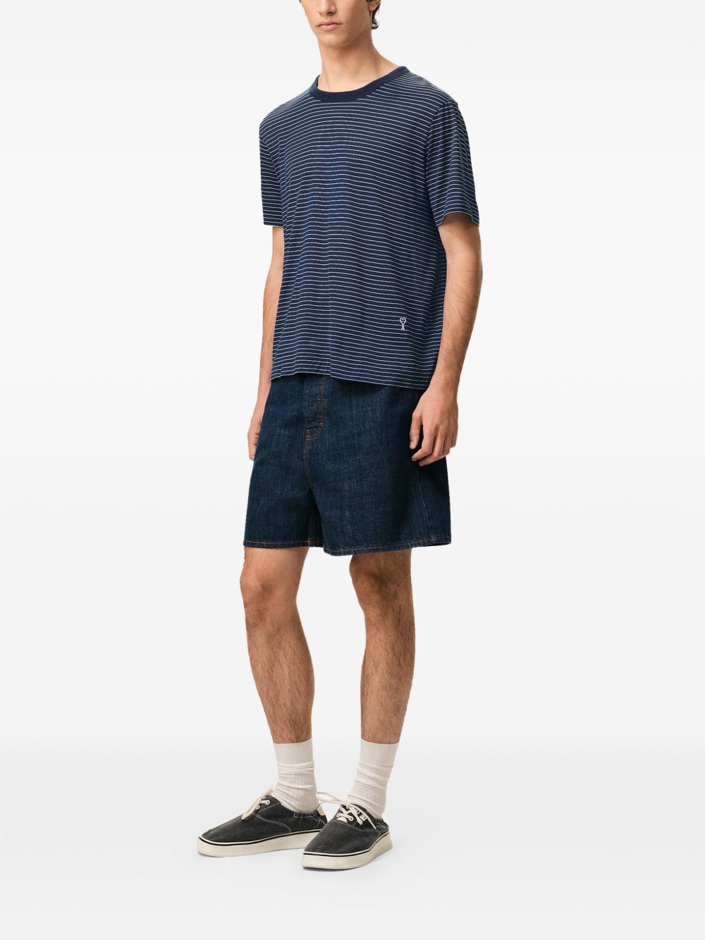 ink blue white striped embroidery short sleeves round neck
