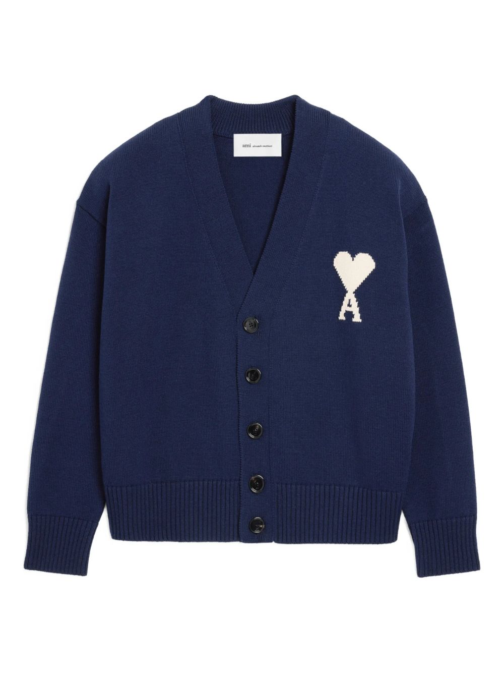 blue heart motif V-neck button fastening ribbed knit long sleeves