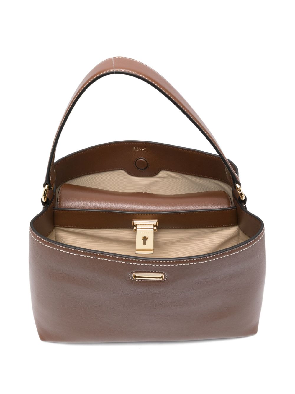 brown leather top handle key-lock fastening contrast stitching