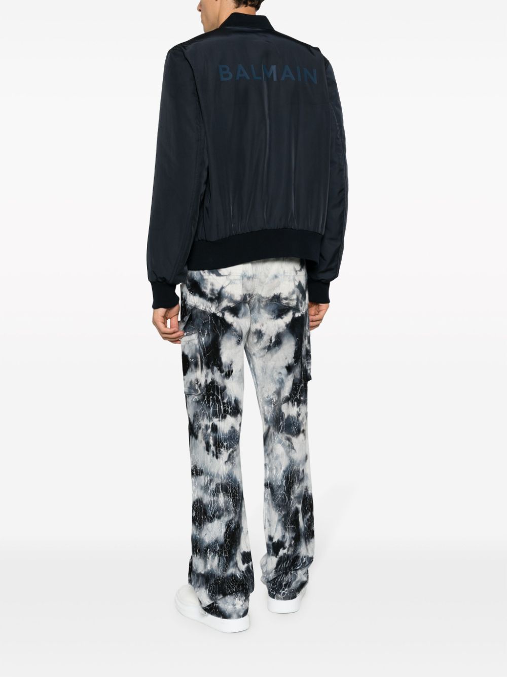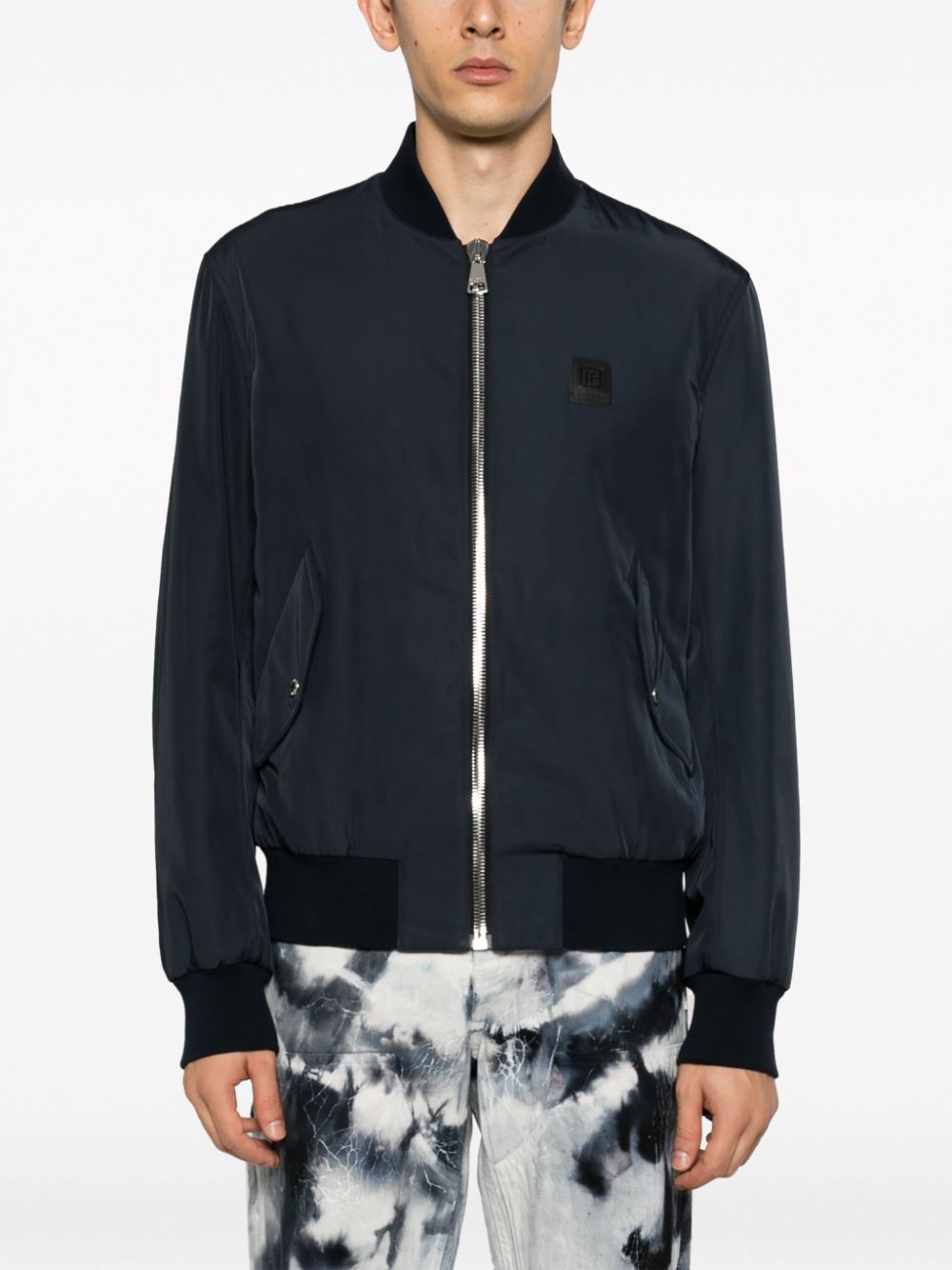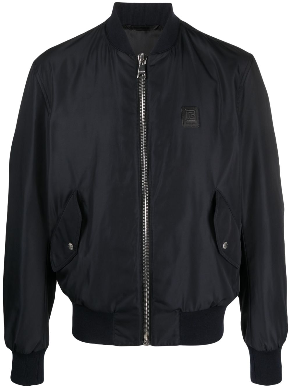 logo-applique zipped bomber jacket from Balmain featuring midnight blue, ribbed band collar, front zip fastening, logo patch at the chest, two side flap pockets, long sleeves, ribbed cuffs and hem and appliqué logo.