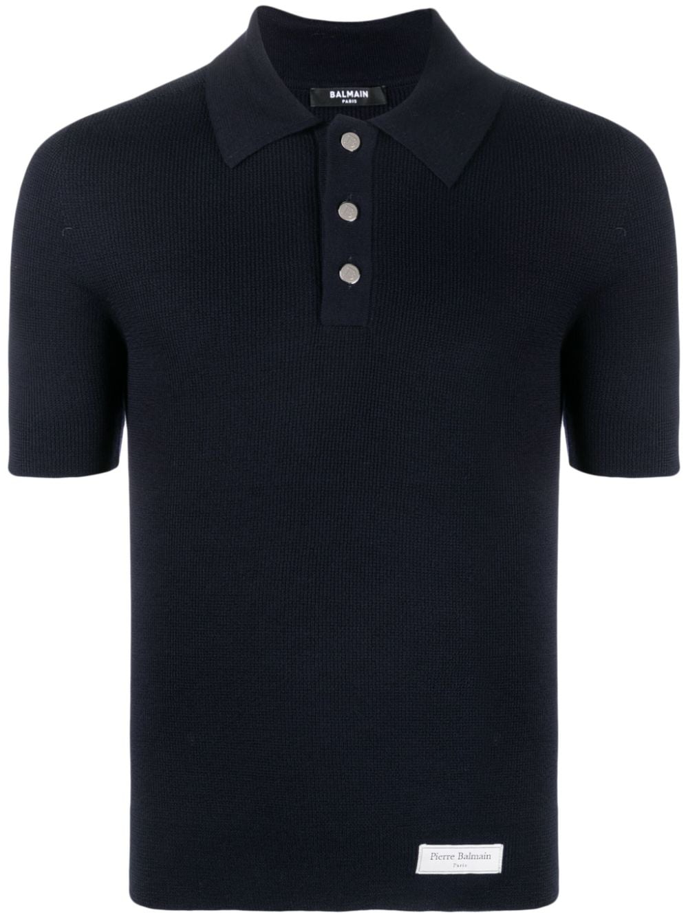 logo-patch wool polo shirt from Balmain featuring midnight blue, merino wool, fine ribbed, polo collar, front button placket, short sleeves, logo patch to the front and straight hem.