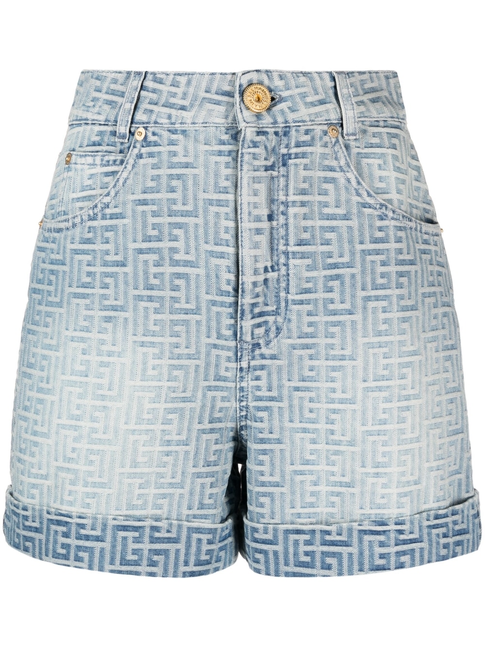 monogram-print cotton denim shorts from Balmain featuring light blue, cotton, monogram print, wide leg, concealed fly and button fastening, classic five pockets and folded edge.