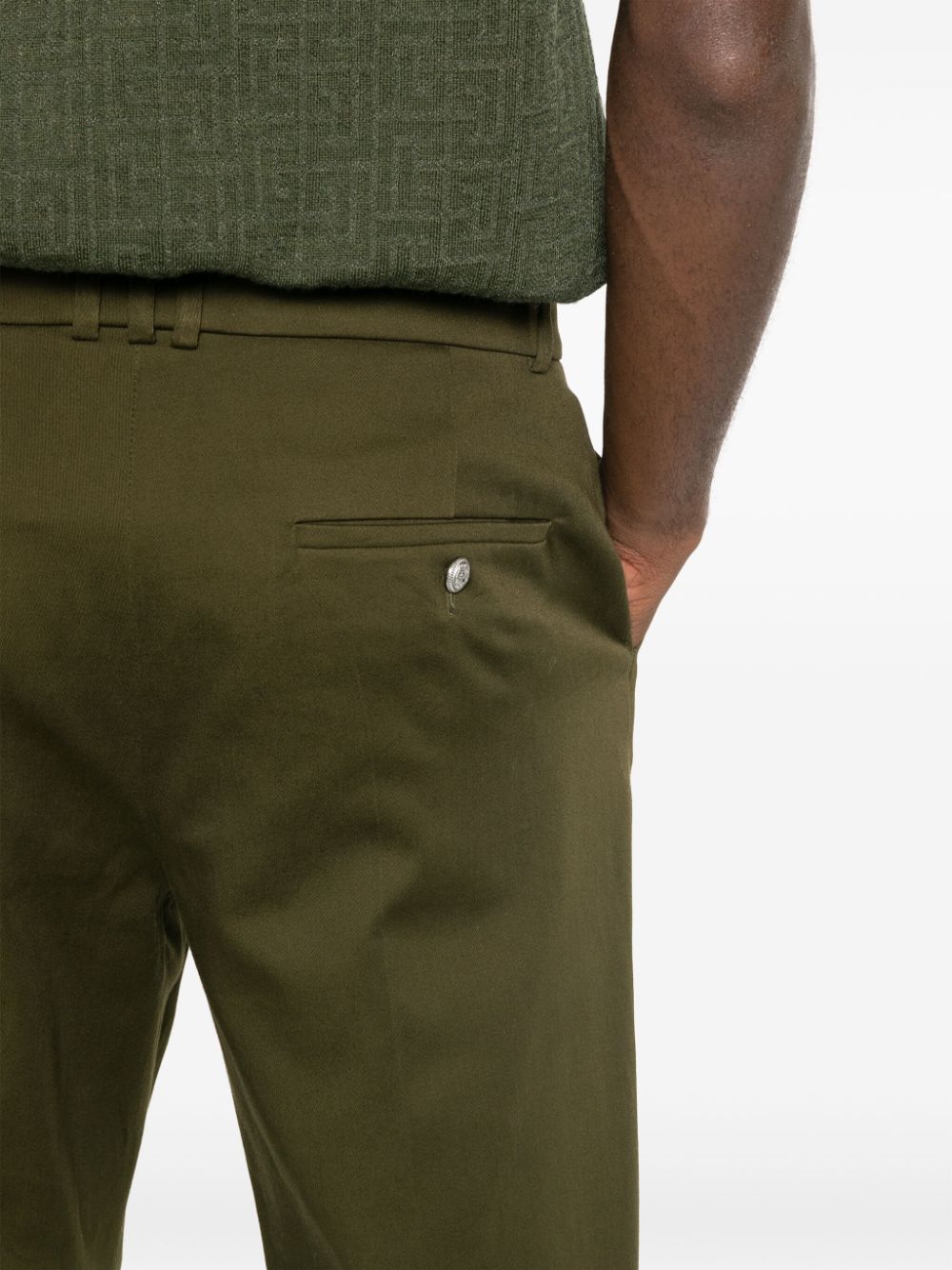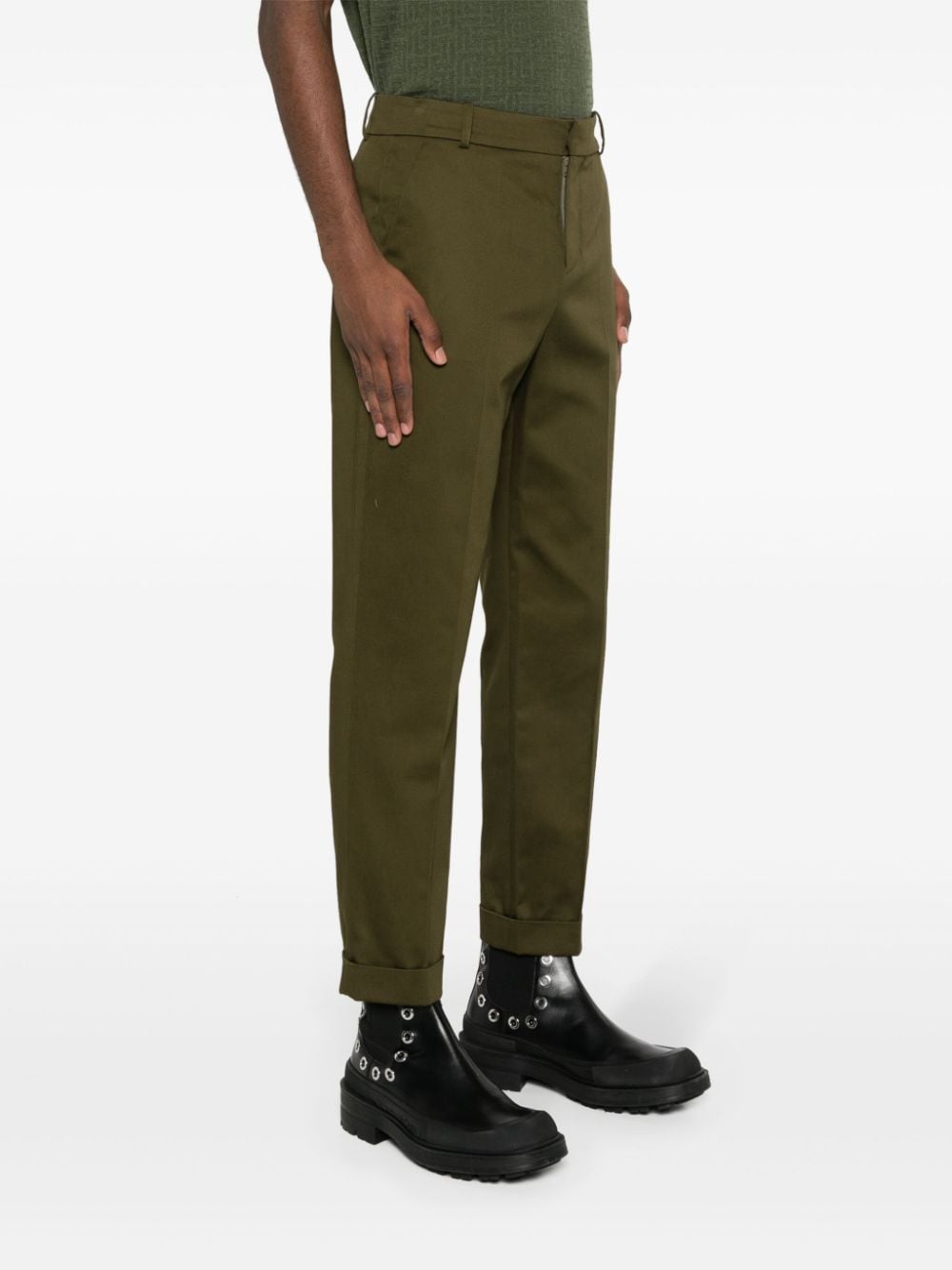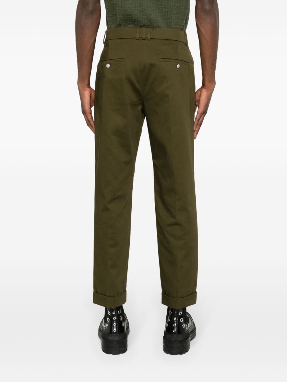 khaki cotton tapered leg belt loops pressed crease two diagonal pockets to the sides two rear button-fastening pockets turn-up cuffs concealed front button, hook and zip fastening