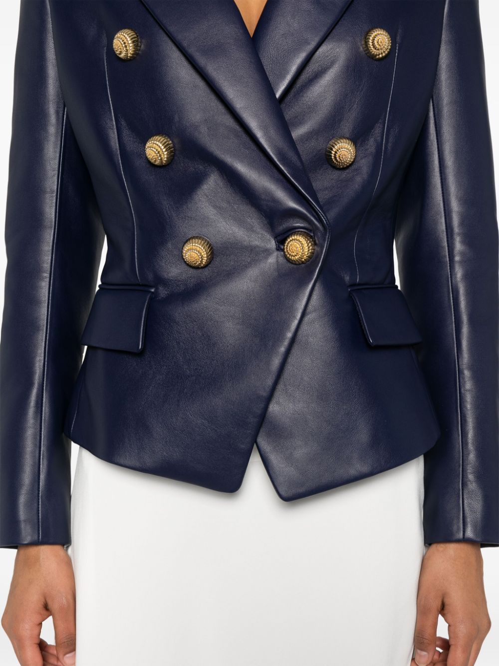 midnight blue lambskin smooth grain double-breasted button fastening peak lapels shoulder pads long sleeves buttoned cuffs dart detailing two side flap pockets Italian rear vents full lining high-low hem
