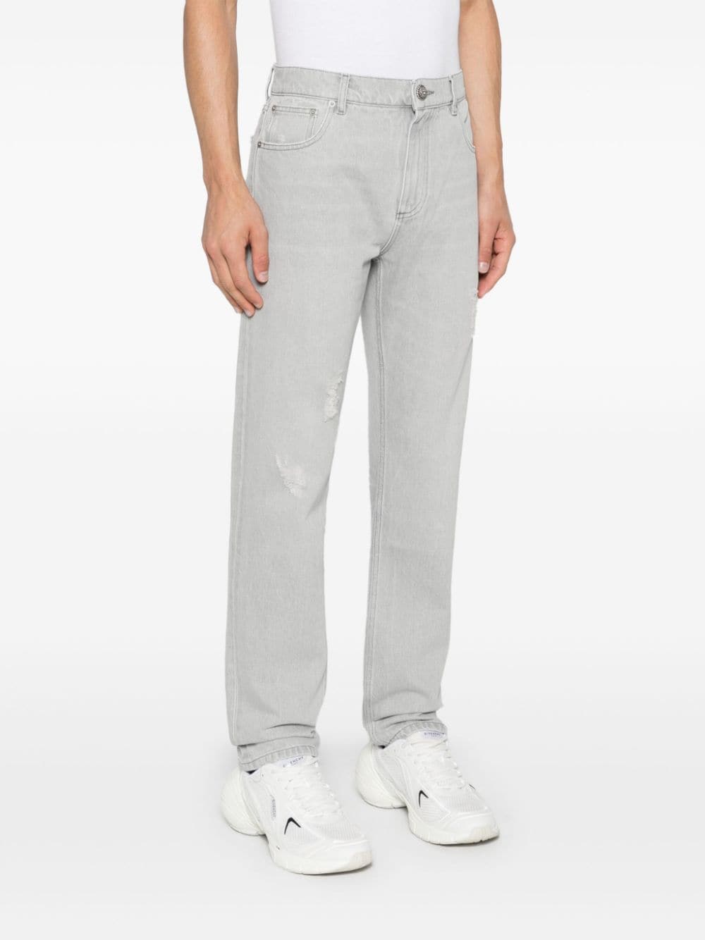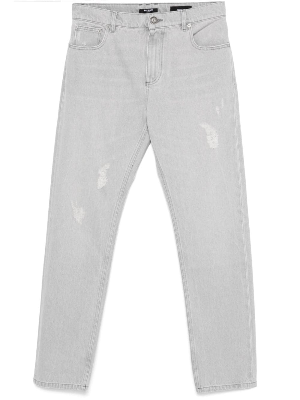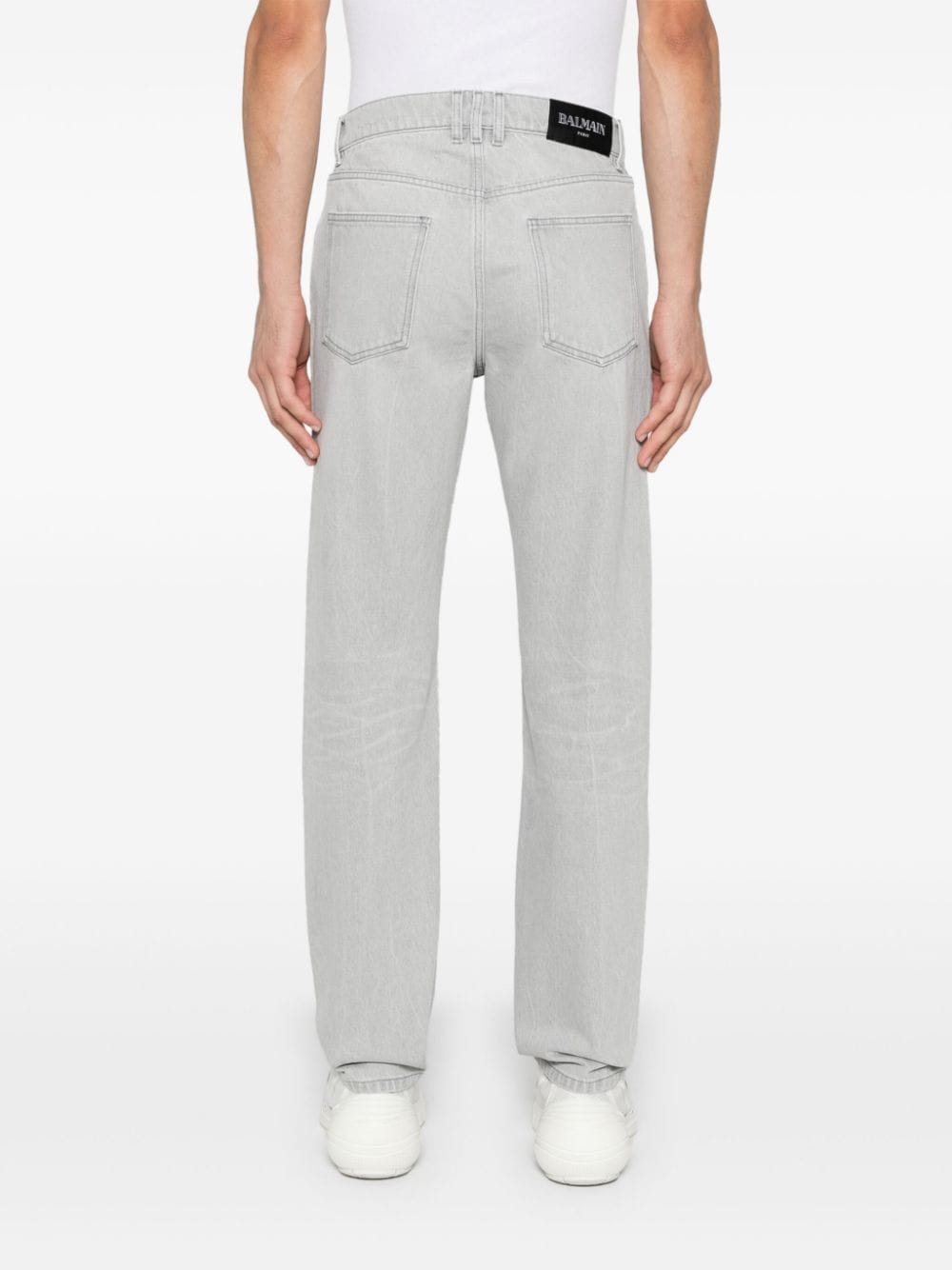 light grey cotton washed denim distressed effect front button and zip fastening belt loops classic five pockets logo patch to the rear straight leg