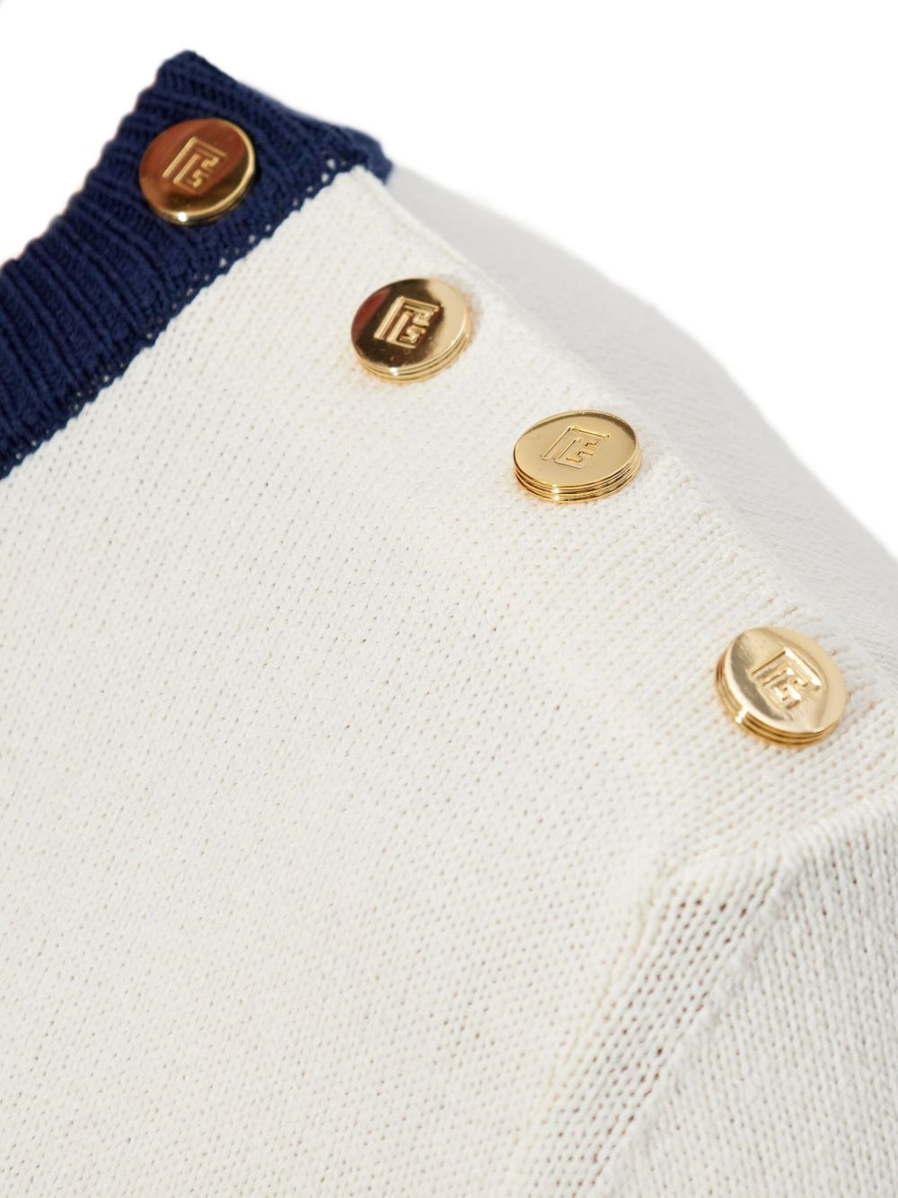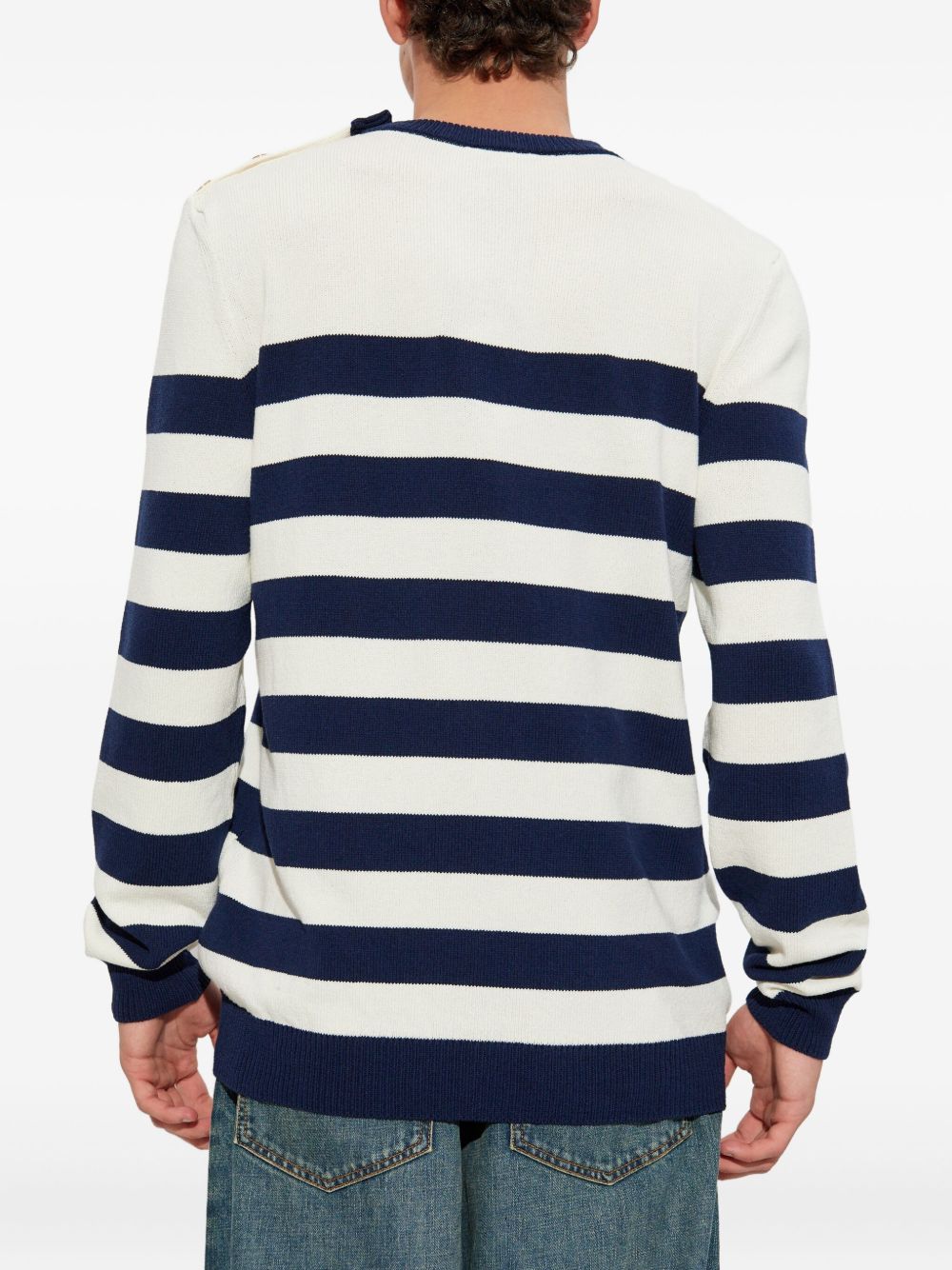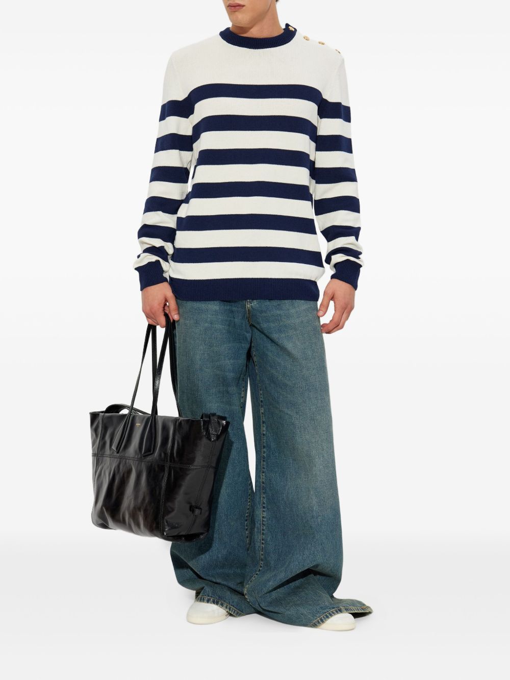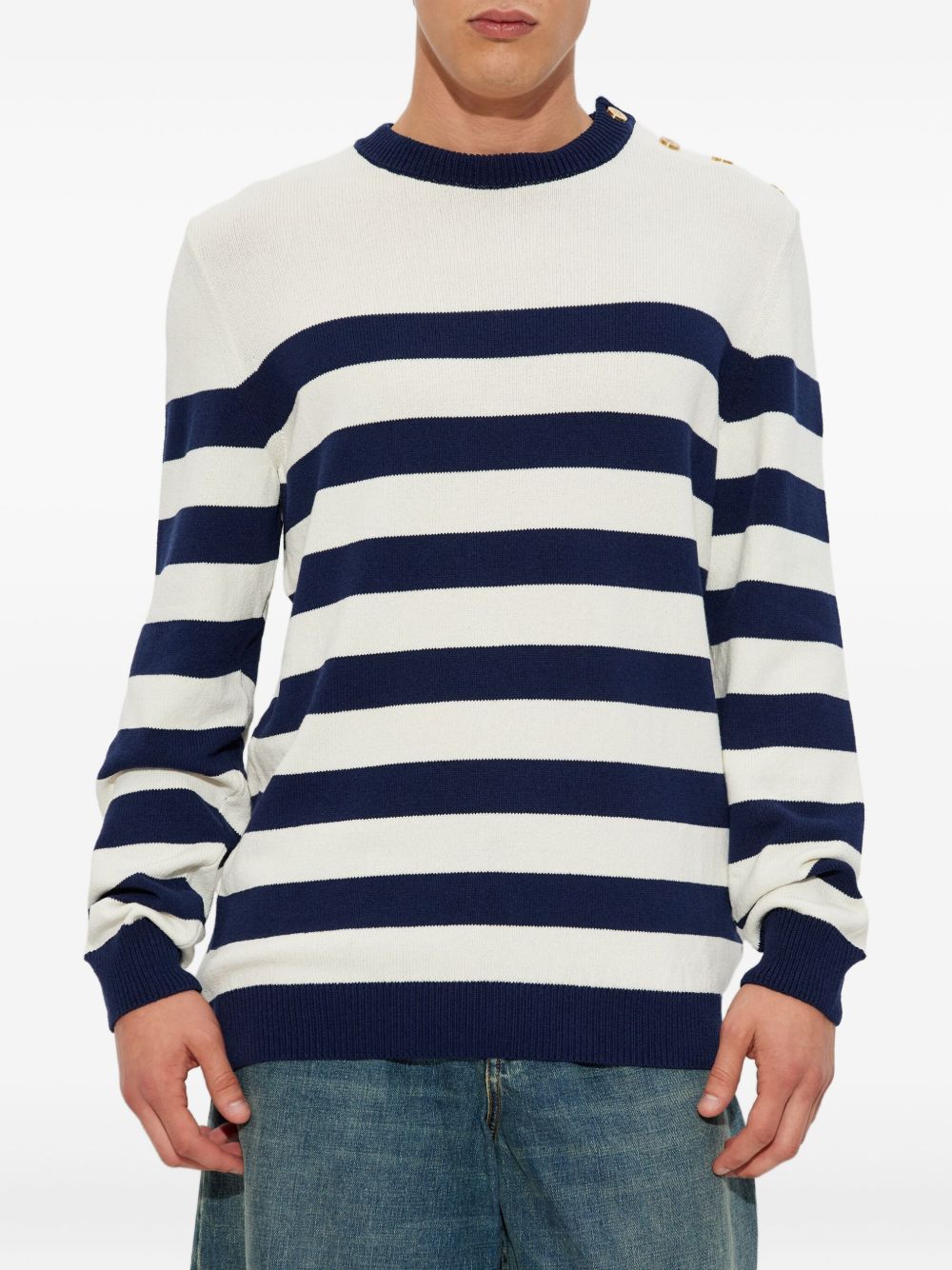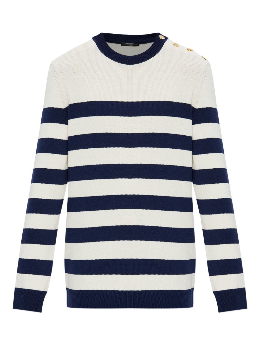 white and black striped pattern round neck button fastening at the shoulder long sleeves ribbed hem