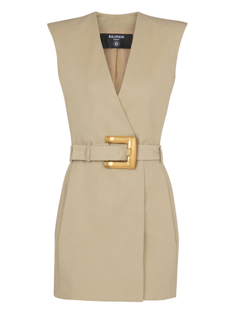 beige cotton gabardine V-neck sleeveless belted waist gold-tone hardware sleeveless