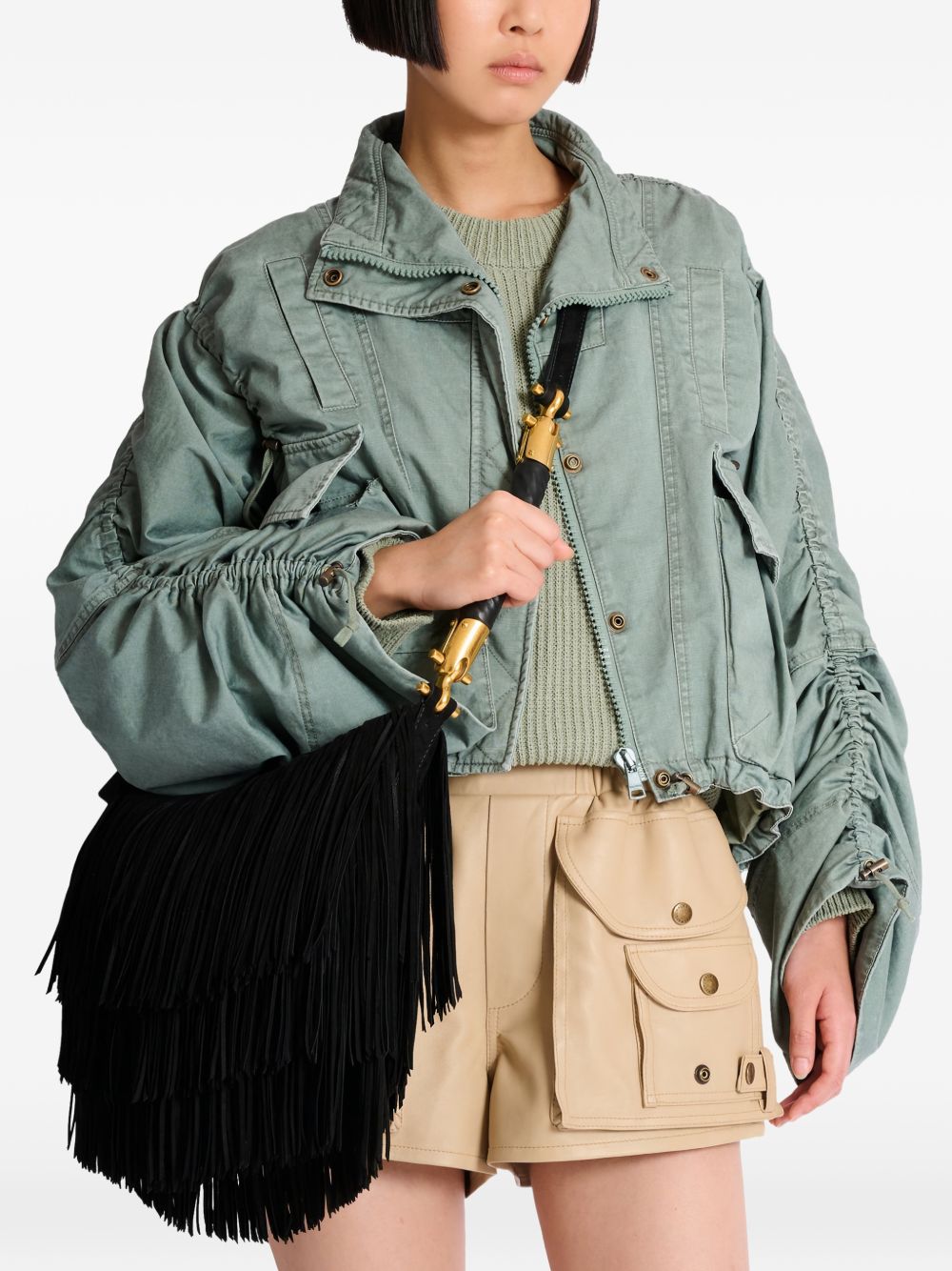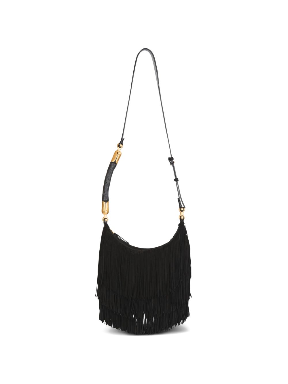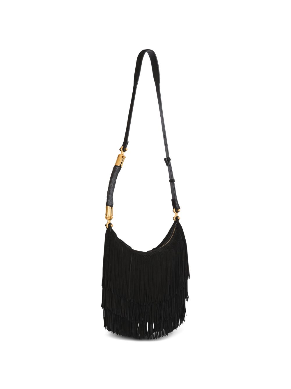 black suede fringe detailing top zip fastening gold-tone hardware adjustable strap