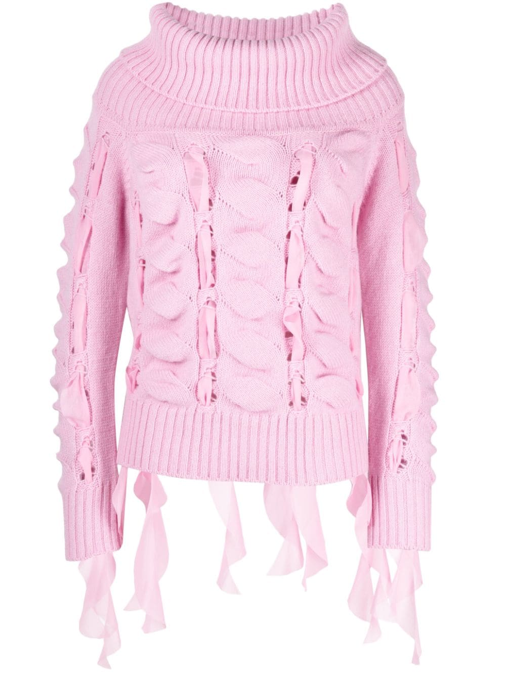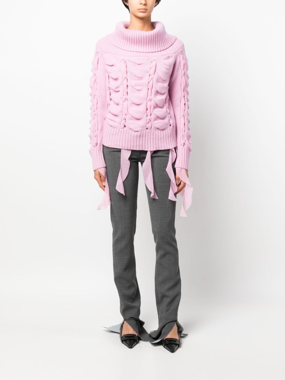 knitted roll-neck jumper from BLUMARINE featuring light pink, wool, knitted construction, ruffled detailing, roll neck, long sleeves and ribbed cuffs and hem.