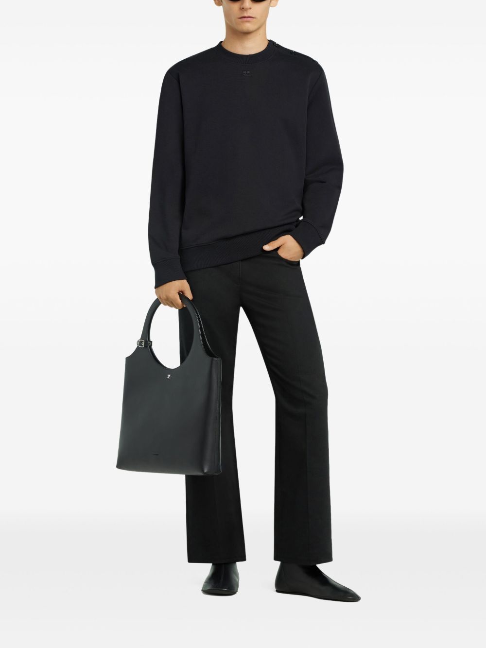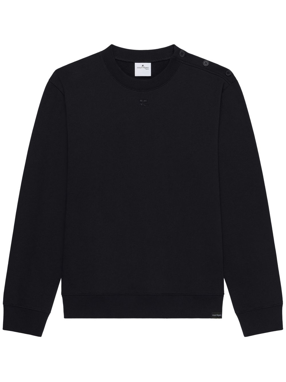 black crew neck button fastening at the shoulder long sleeves ribbed cuffs and hem
