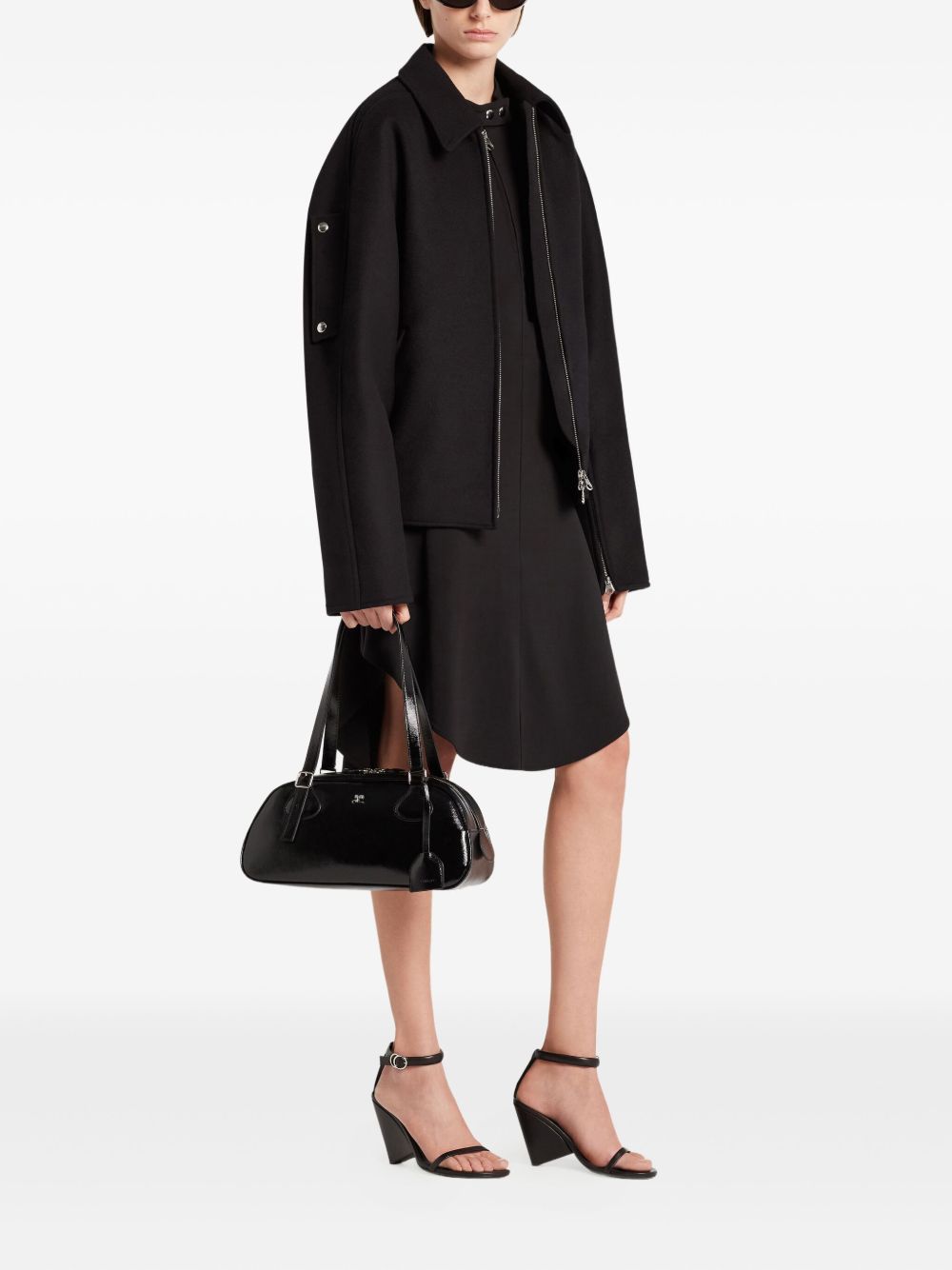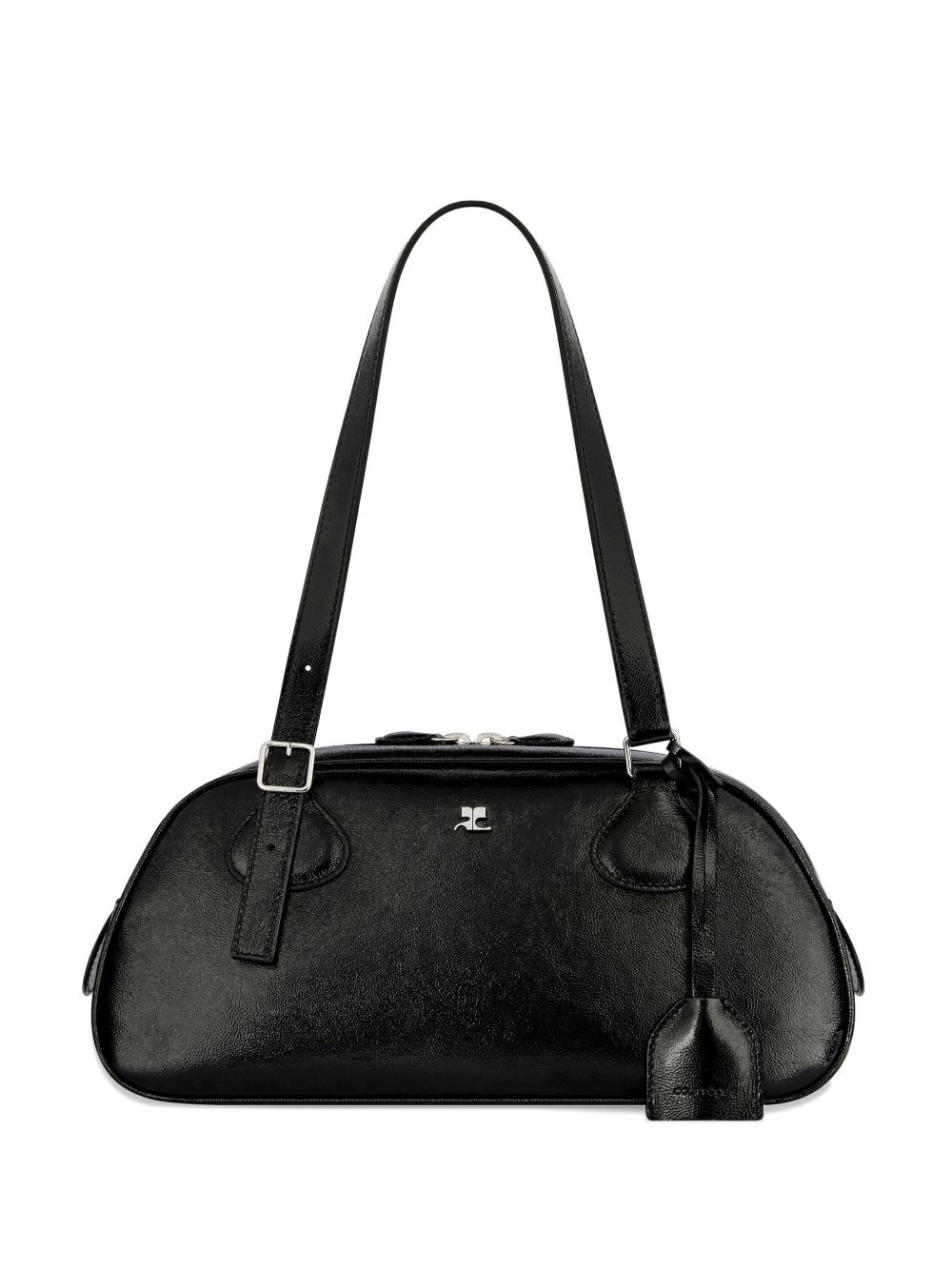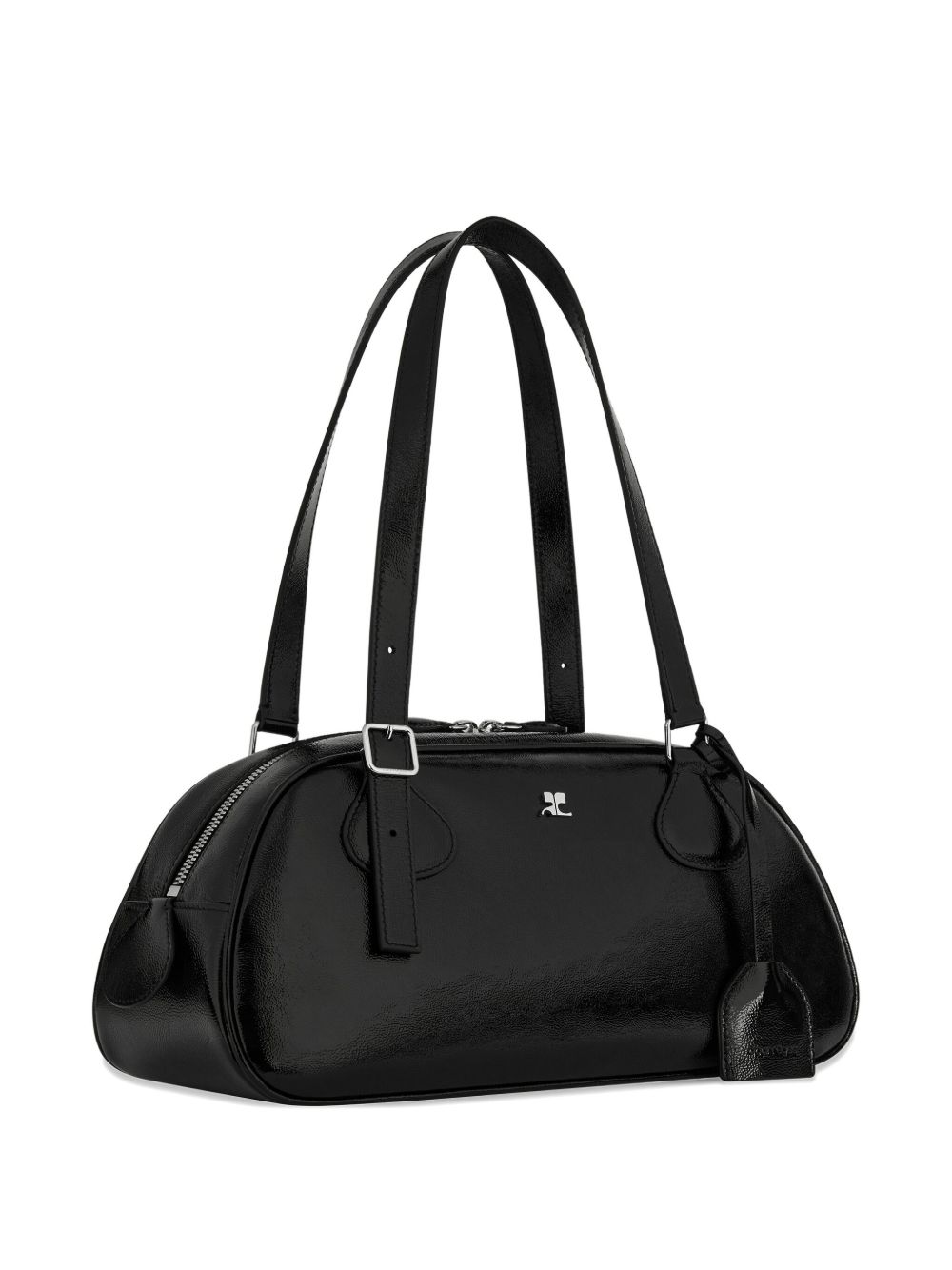 black dual adjustable shoulder straps logo plaque detail detachable charm zip top fastening