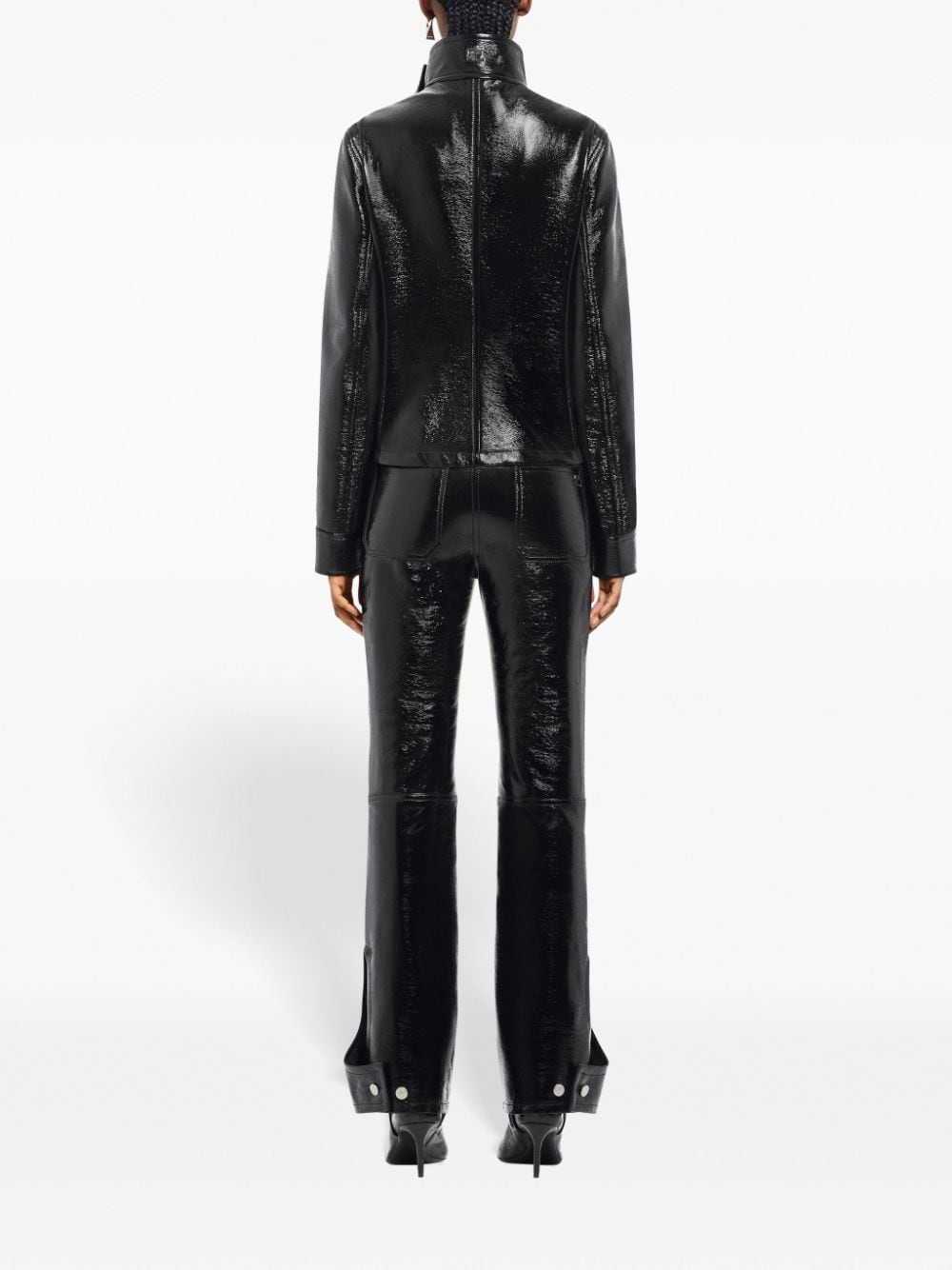 black cotton blend coated finish appliqué logo mid-rise concealed fly and button fastening belt loops flared classic five pockets cropped