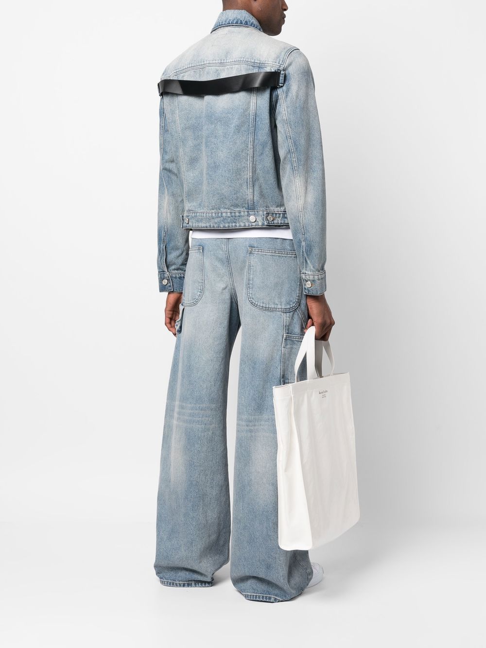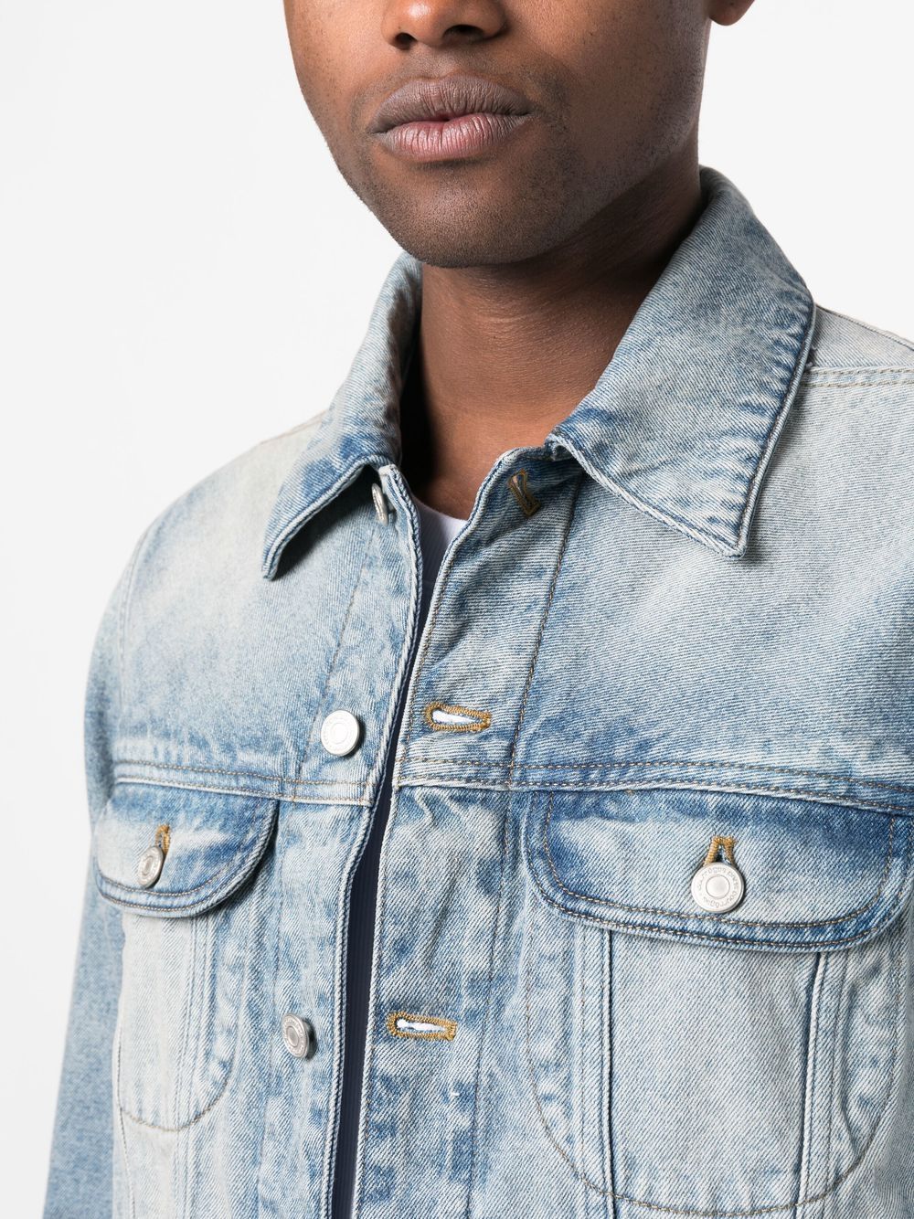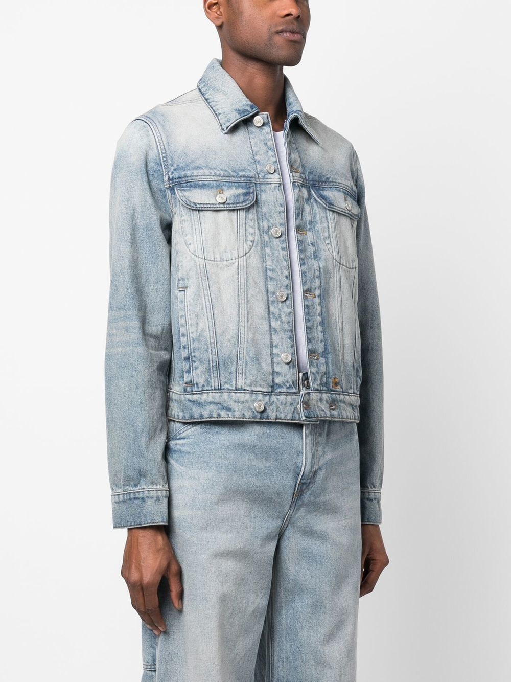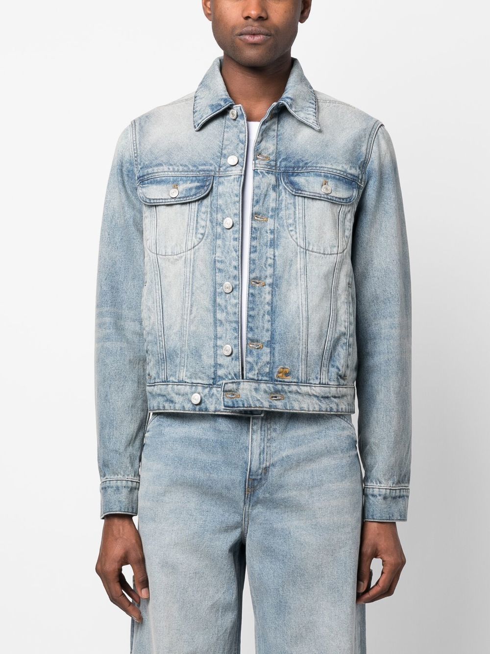 washed-denim jacket from COURRÈGES featuring blue, cotton, washed denim, classic collar, front button fastening, long sleeves, two chest patch pockets and two side slit pockets.