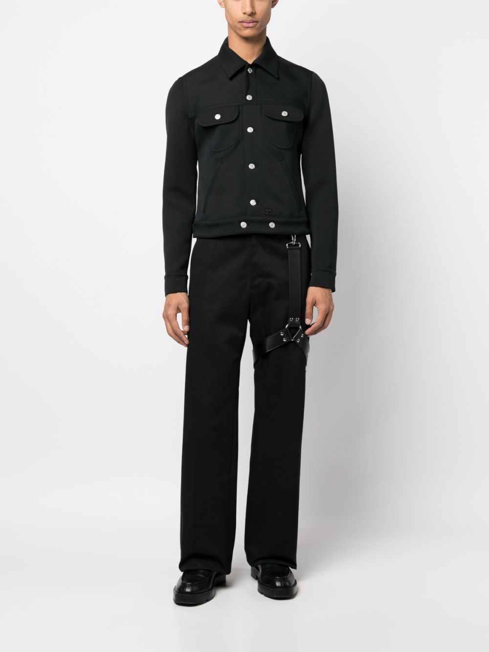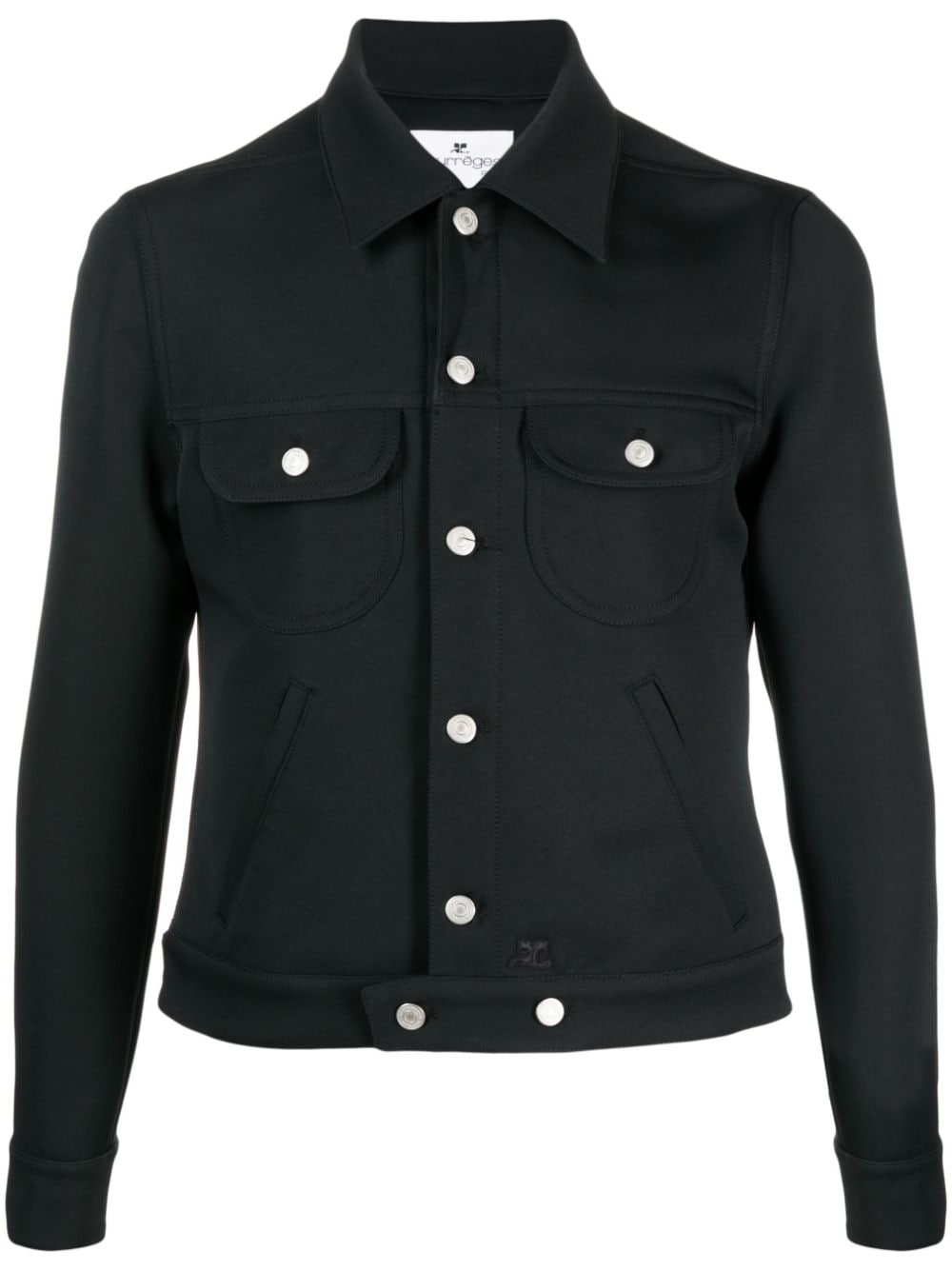 black cotton classic collar front button fastening two chest flap pockets two side slit pockets long sleeves straight hem