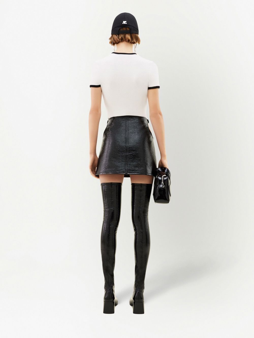 black cotton jersey texture ribbed contrasting borders crew neck short sleeves logo patch to the front straight hem