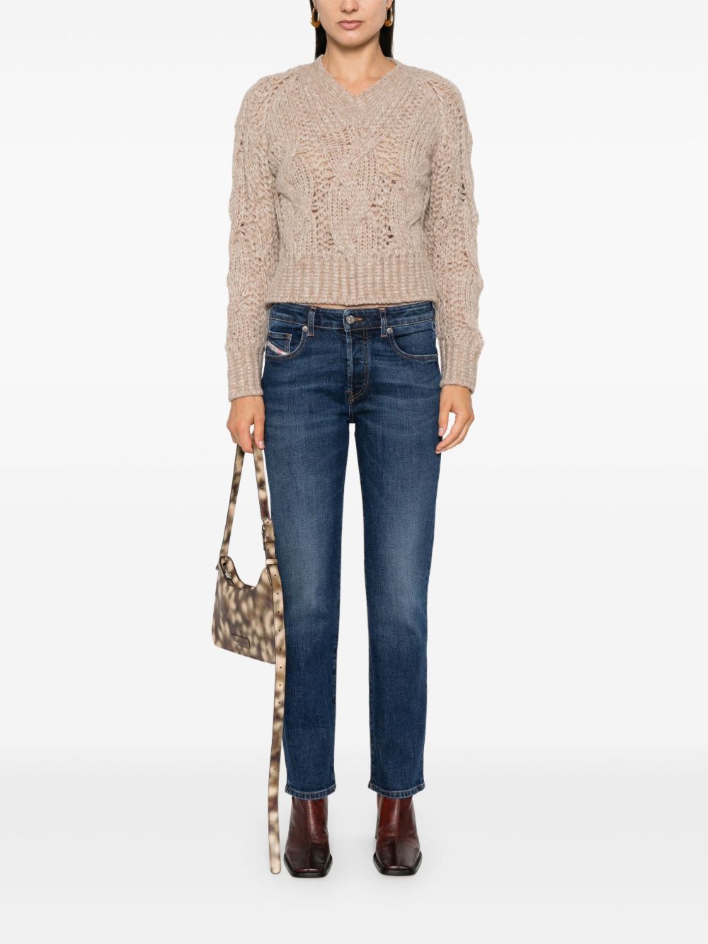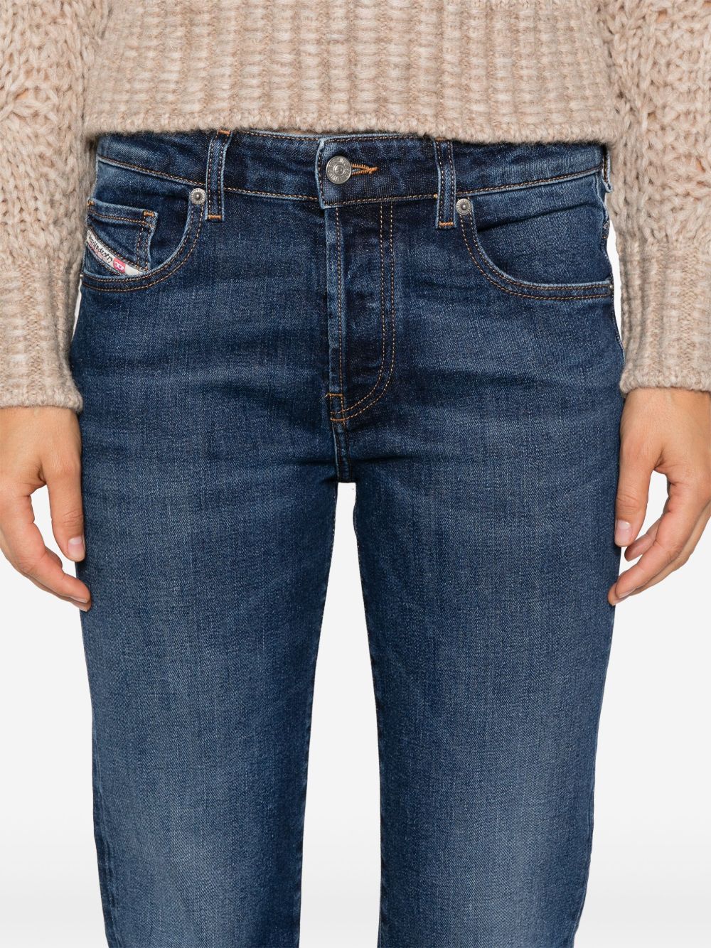 indigo blue stretch-cotton washed denim concealed front button fastening belt loops logo patch to the front classic five pockets embroidered logo to the side logo patch to the rear straight leg