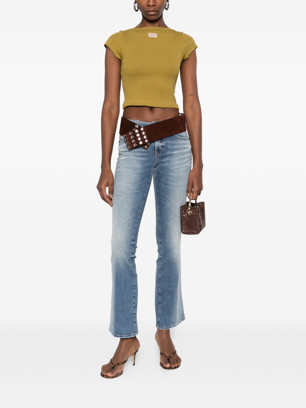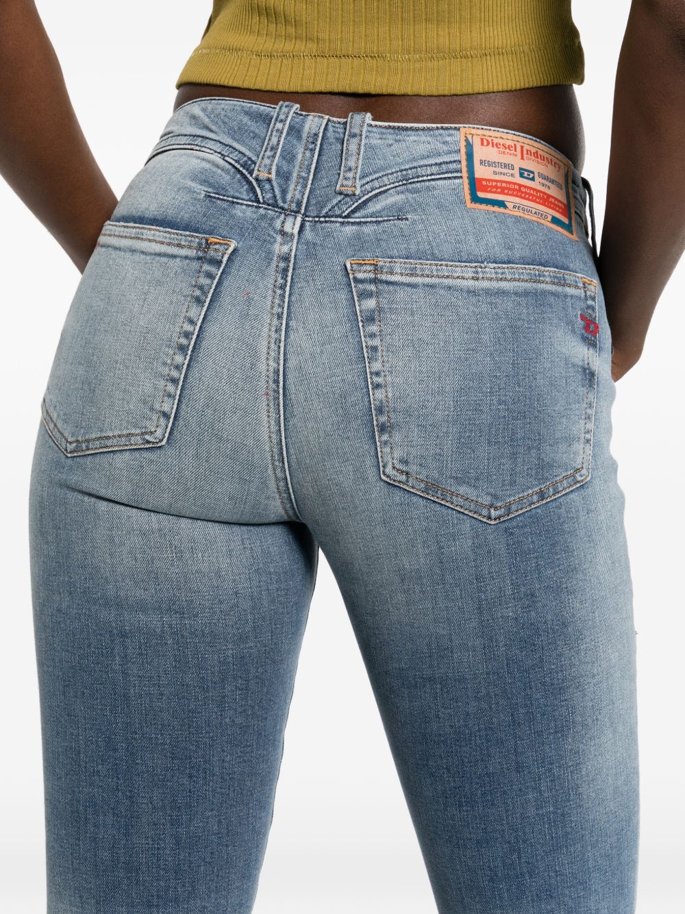 blue faded wash five pockets logo patch belt loops seam detailing