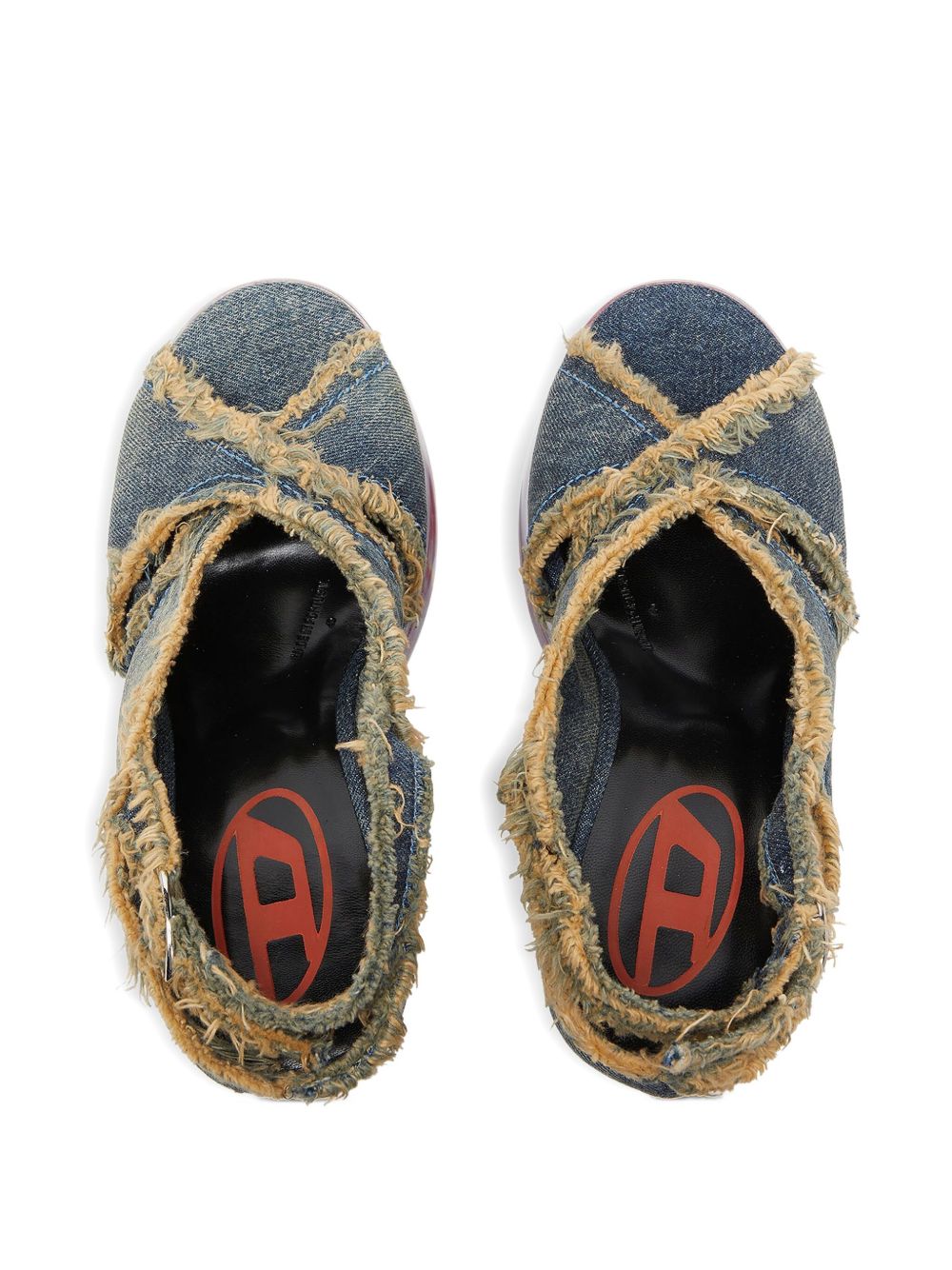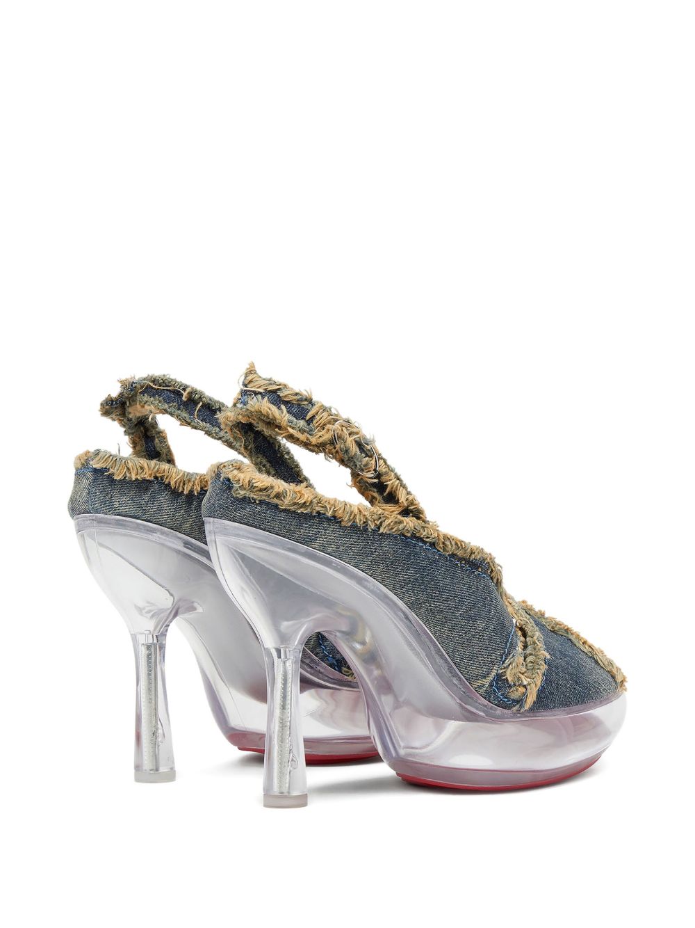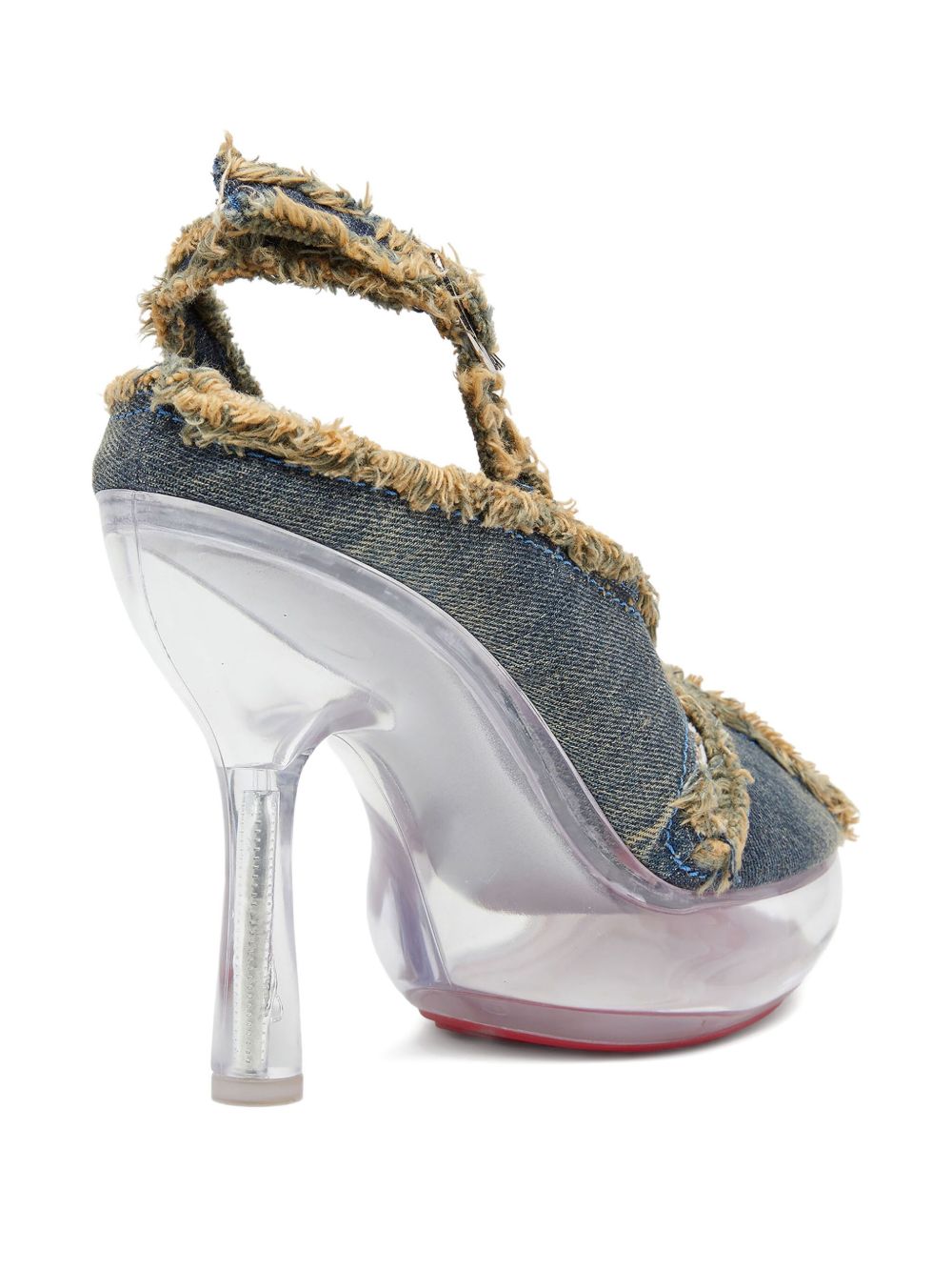 blue denim upper peep toe buckled slingback strap frayed edges