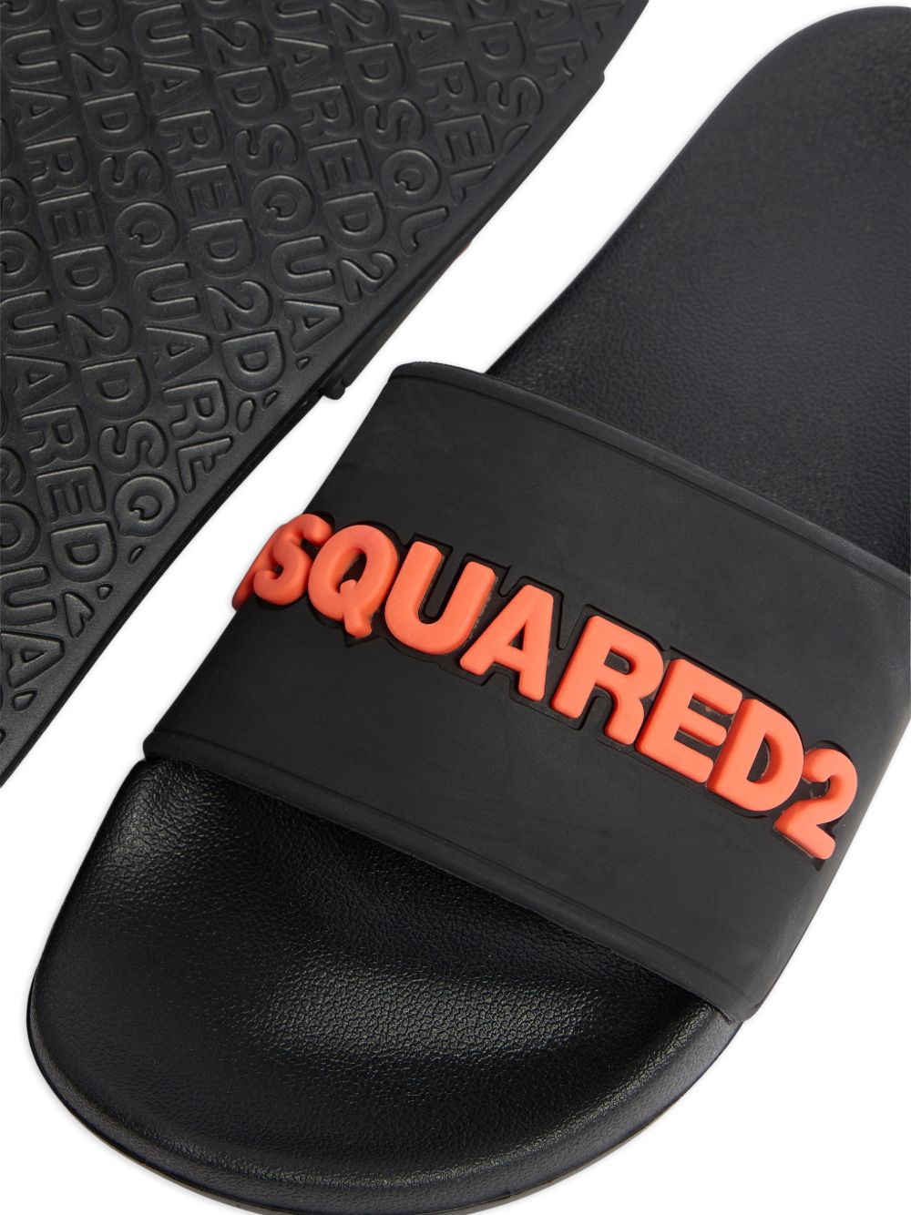 black raised logo lettering open toe slip on style flat sole moulded footbed