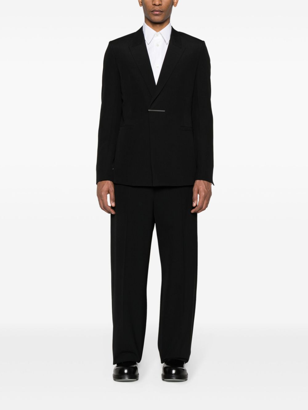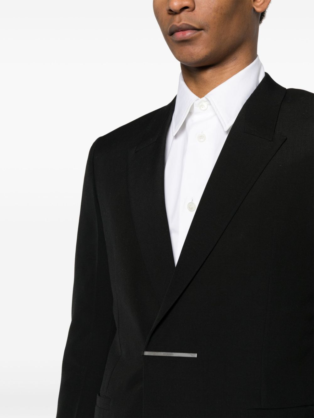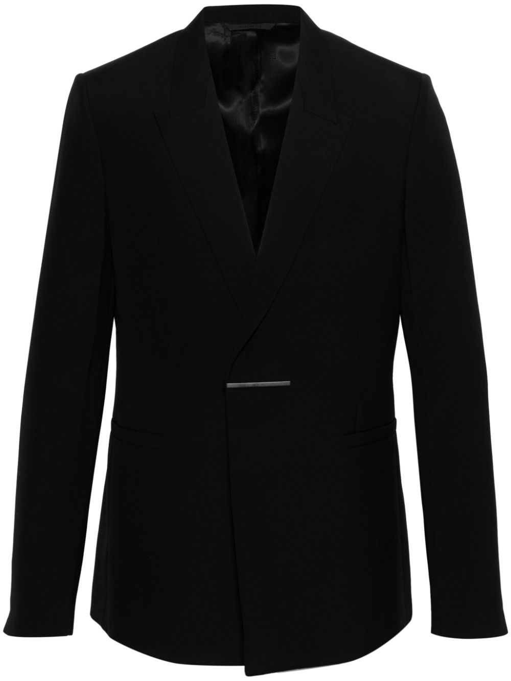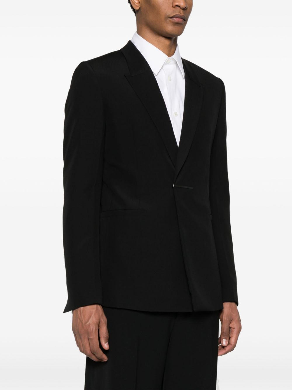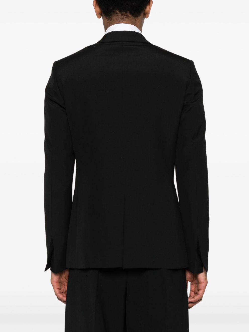 jet black wool silver-tone logo plaque peak lapels concealed front fastening long sleeves split cuffs two front jetted pockets central rear vent straight hem
