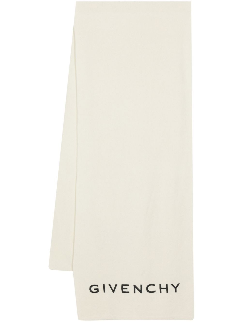 logo-print knitted scarf from GIVENCHY featuring white, wool-cashmere blend, logo print to the front, adjustable fit and finished edge.