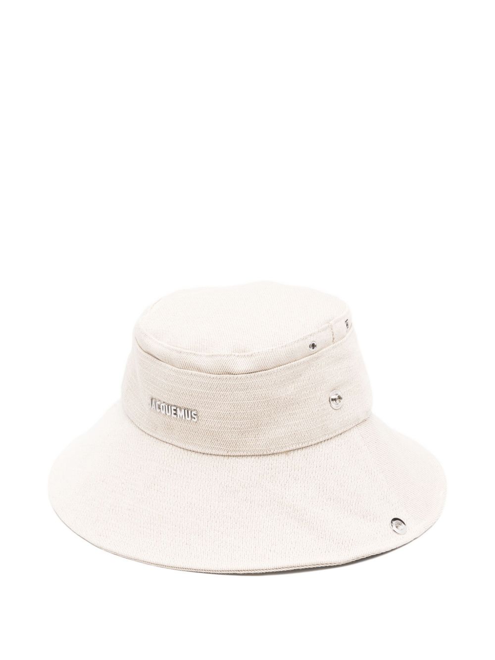 light beige flat crown dropped wide brim logo lettering adjustable strap to the rear