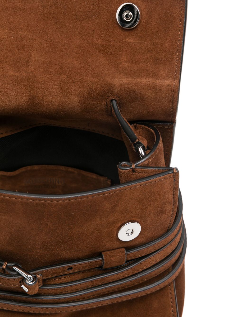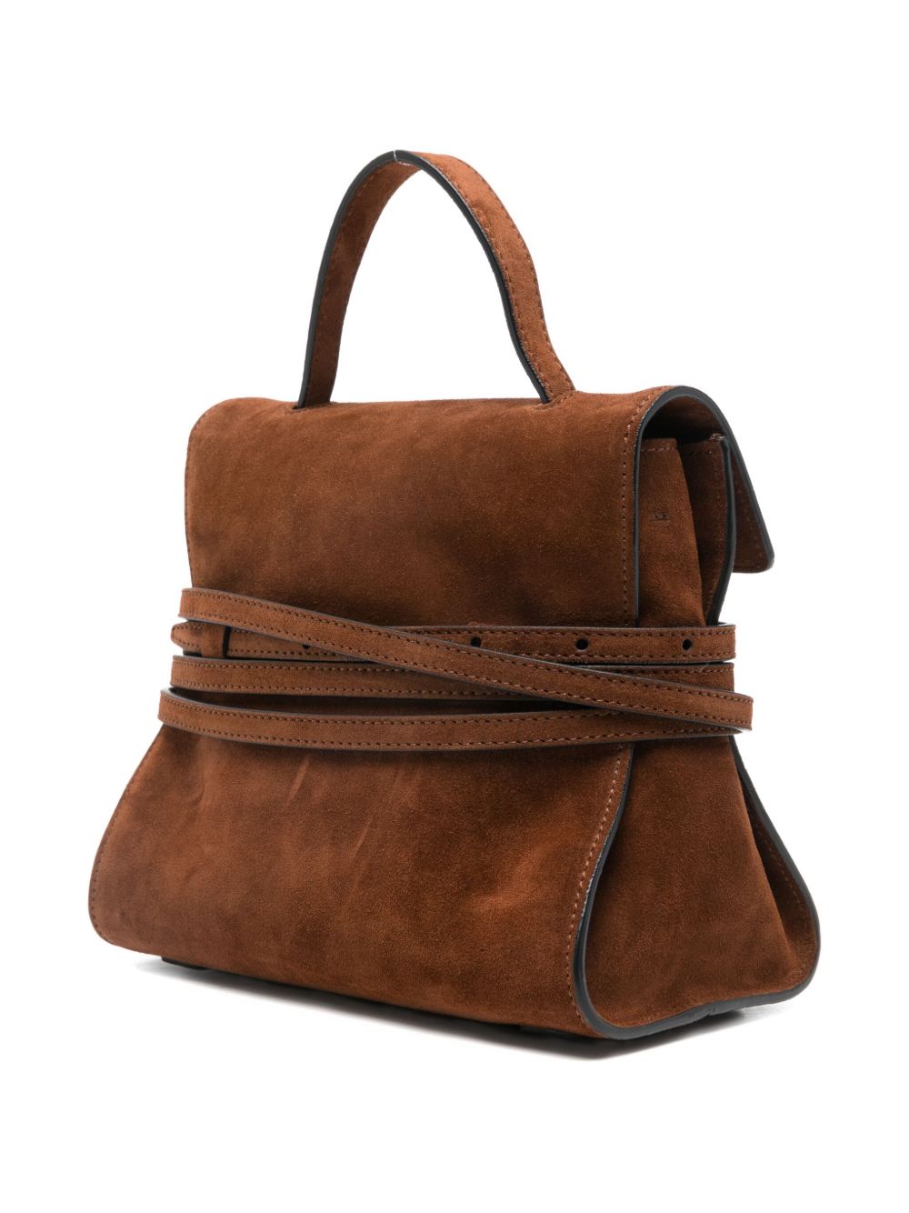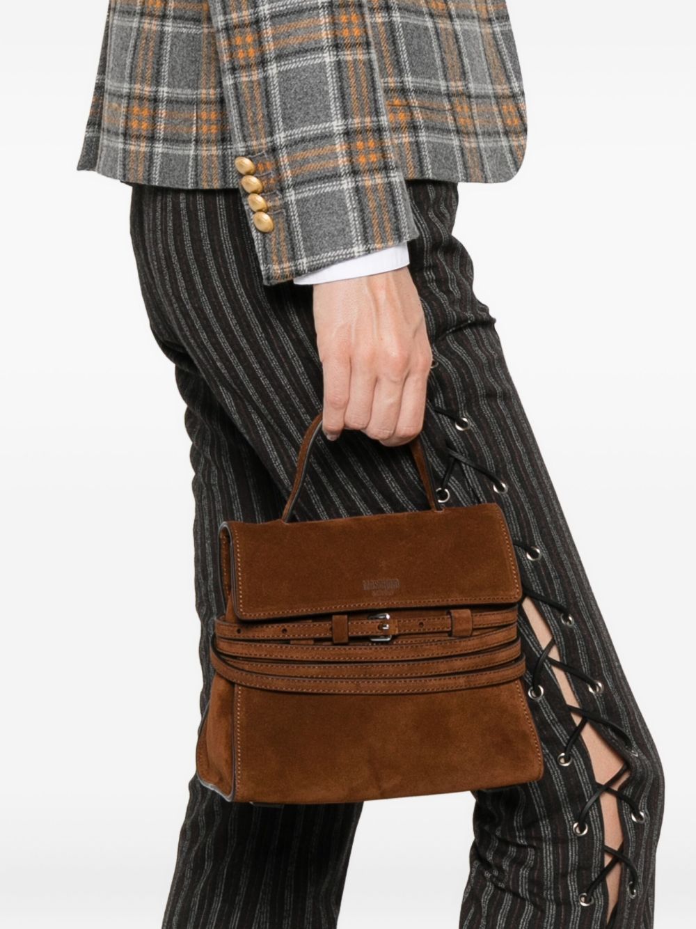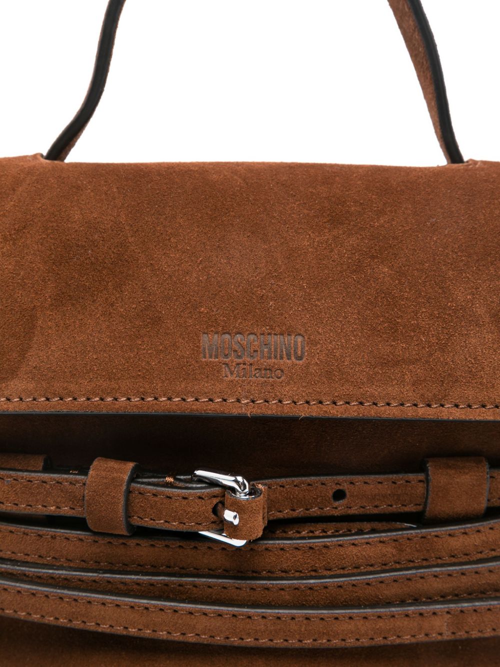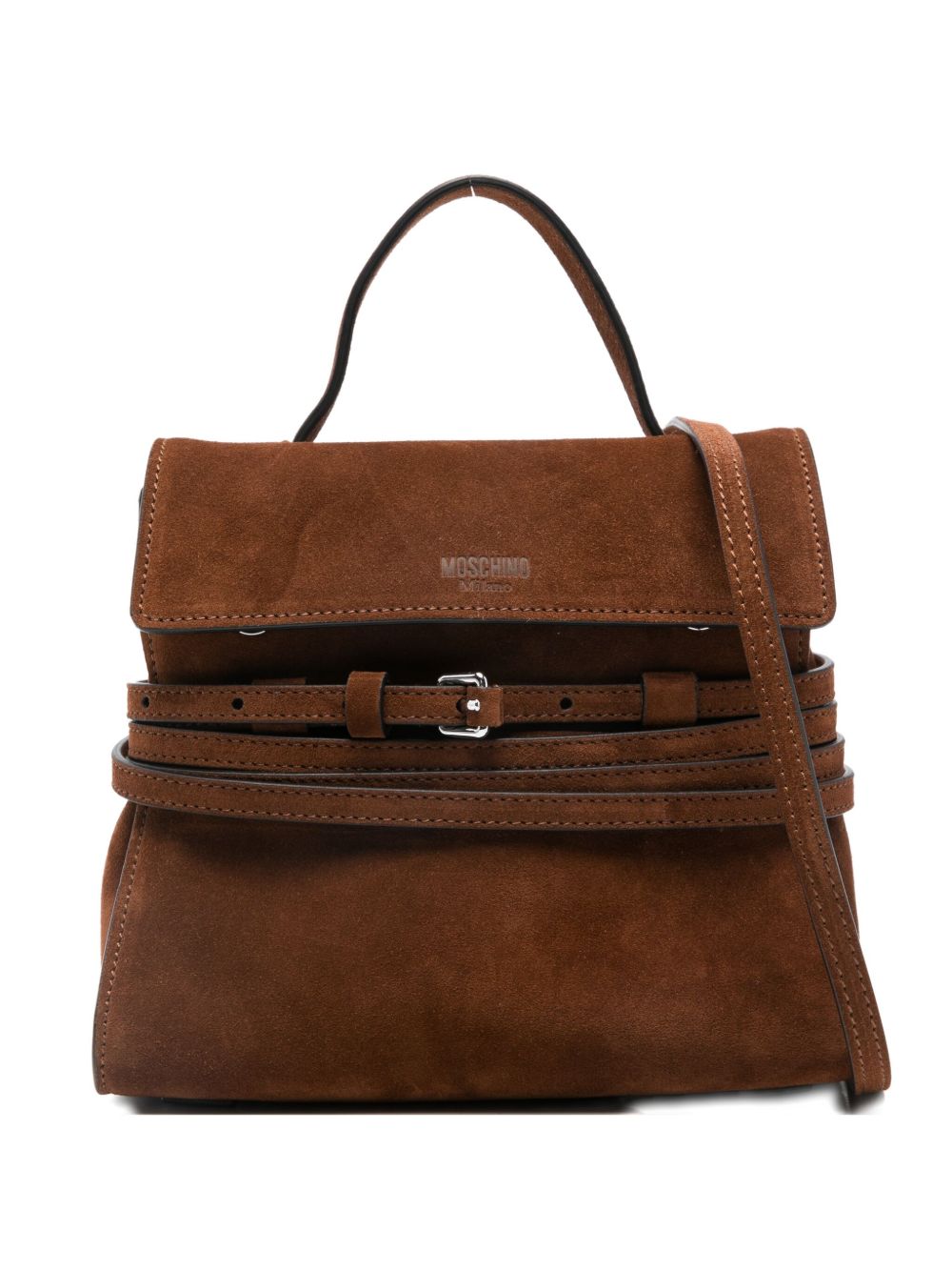 brown suede top handle shoulder strap buckle detail logo detail internal slip pocket