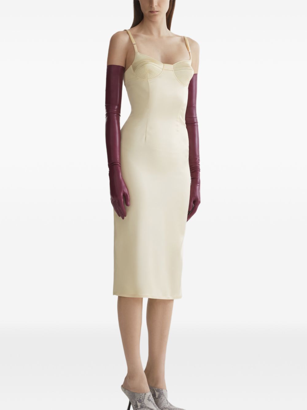 light yellow ribbed bodice adjustable straps square neckline back zip fastening knee length