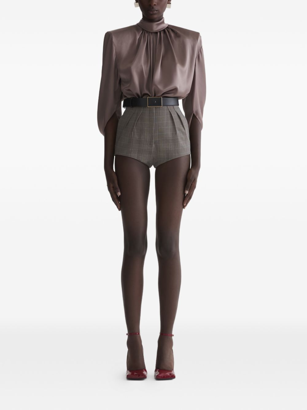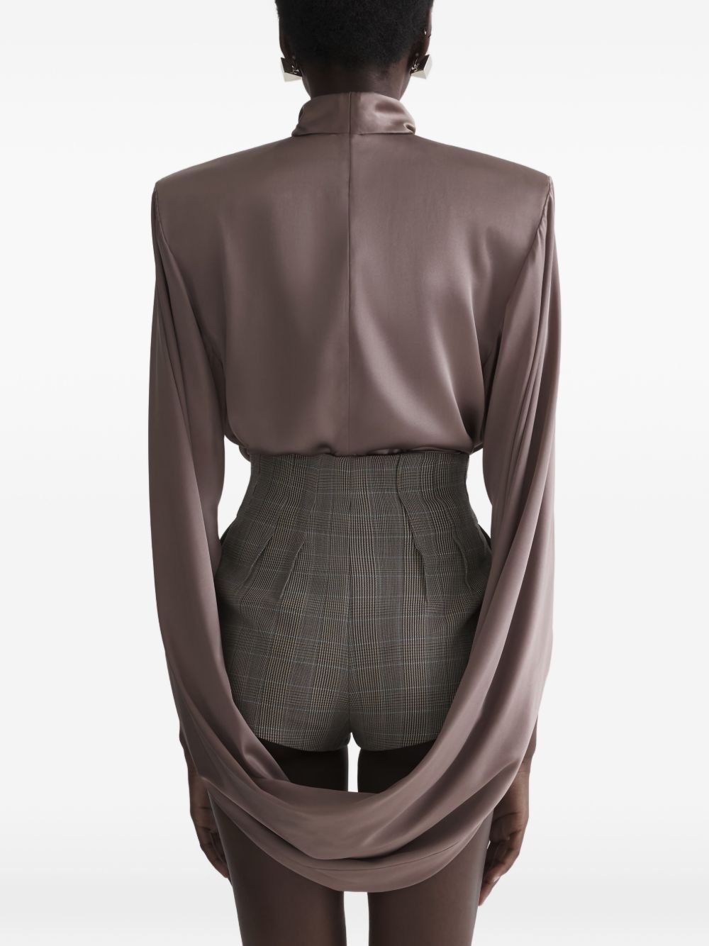 brown draped design high neck long sleeves pleated detail rear zip fastening