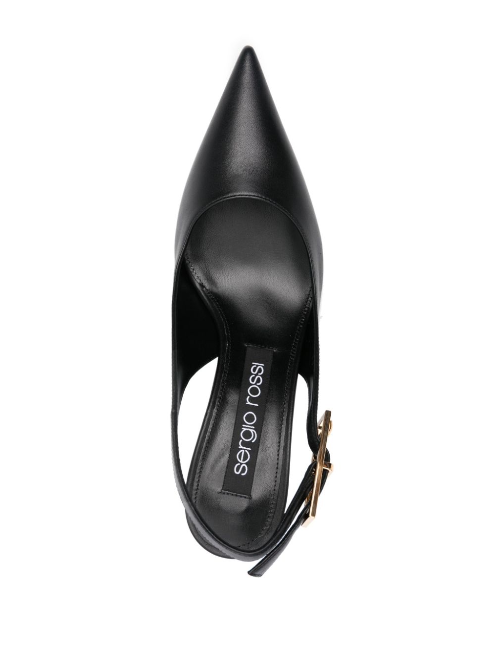 black calf leather grained texture pointed toe branded footbed leather lining buckle-fastening slingback strap 60mm mid sculpted heel leather outsole logo-engraved gold-tone hardware slip-on style This piece comes complete with a protective dust bag.