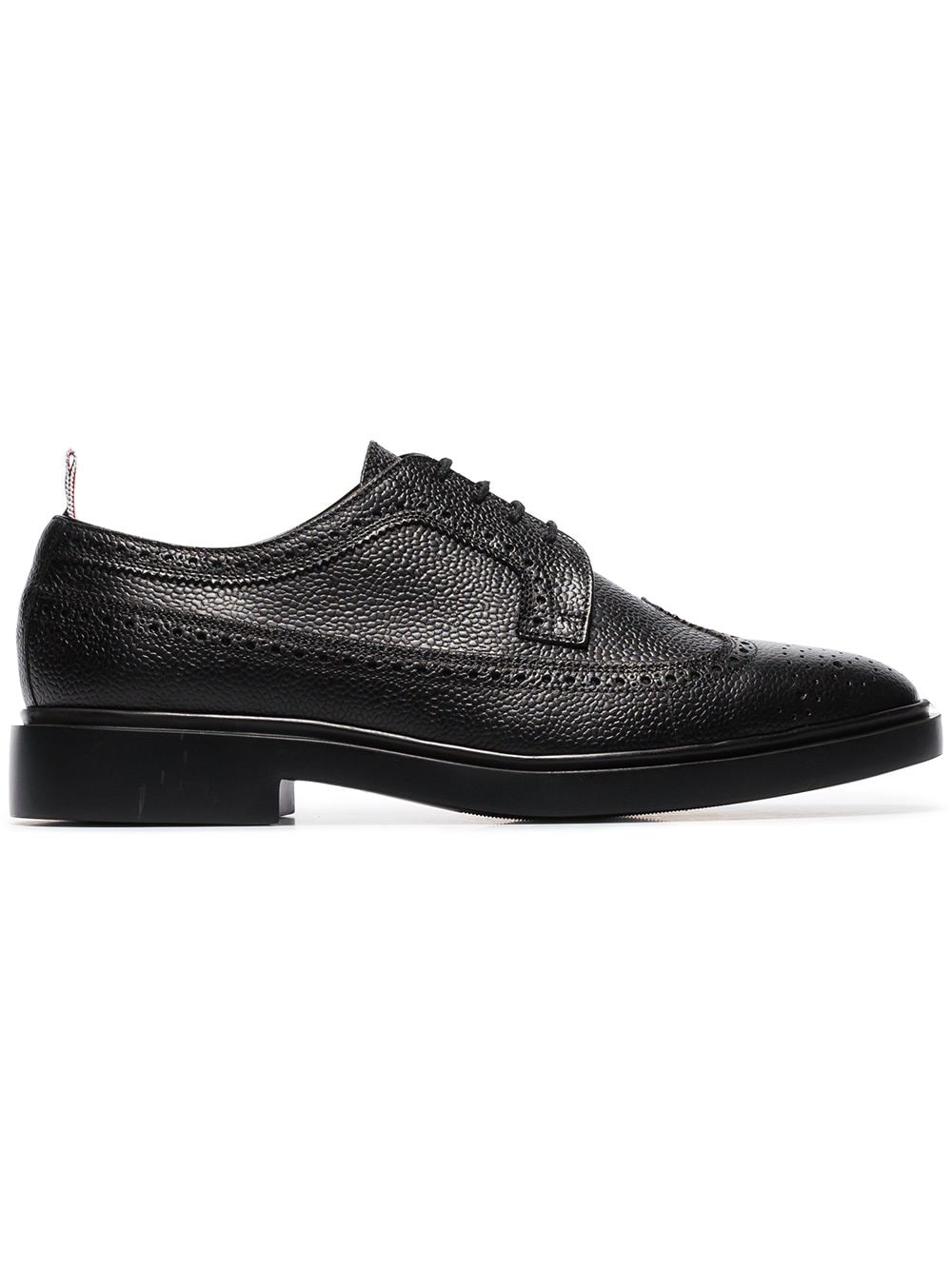 Longwing round-toe brogues from Thom Browne featuring black, calf leather, round toe, front lace-up fastening, branded leather insole, pull-tab at the heel and punch-hole detailing.