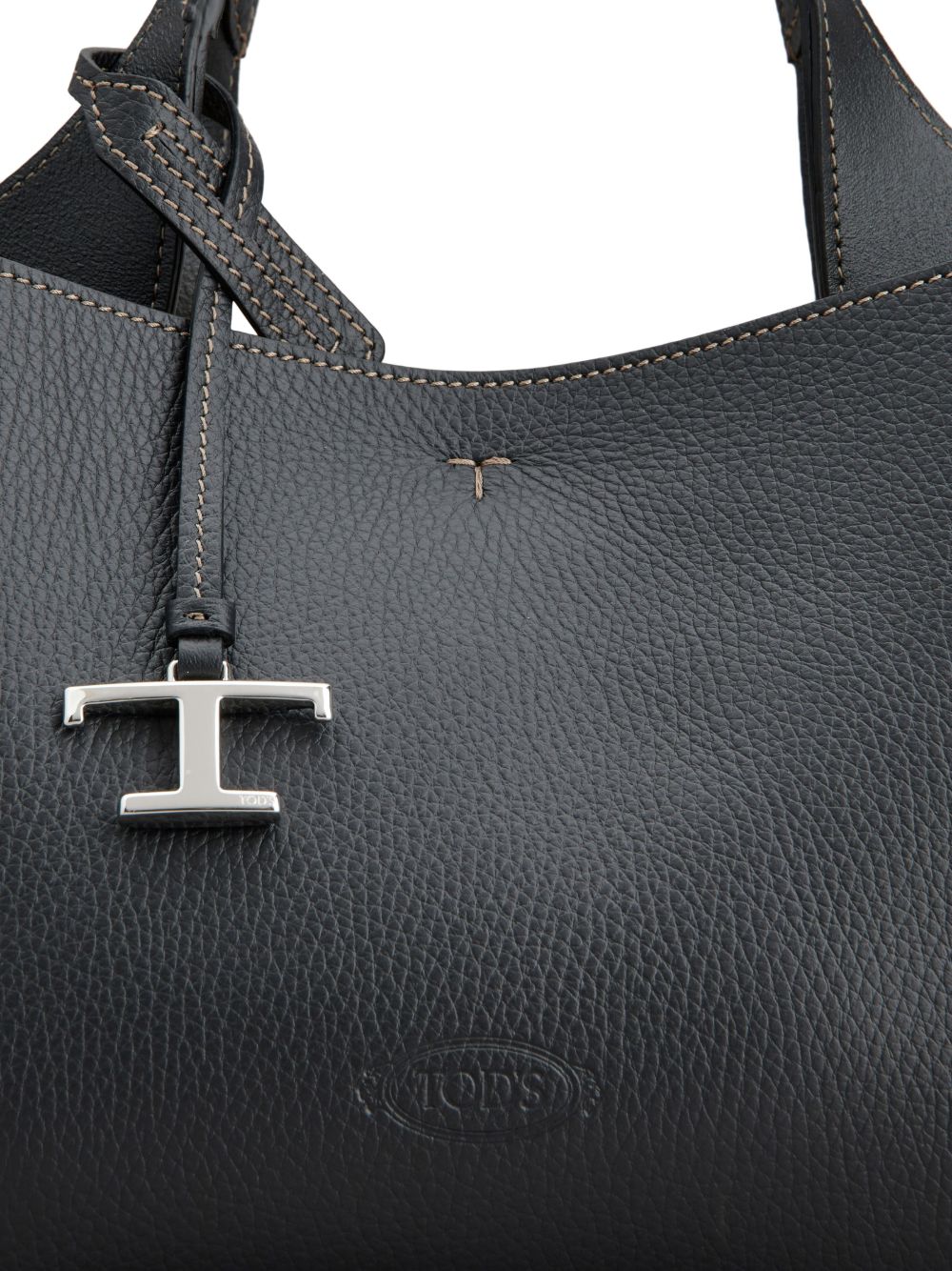 black leather grained texture debossed logo to the front logo pendant decorative stitching hook fastening adjustable detachable shoulder strap two top handles partitioned compartment internal zip-fastening pockets metal feet