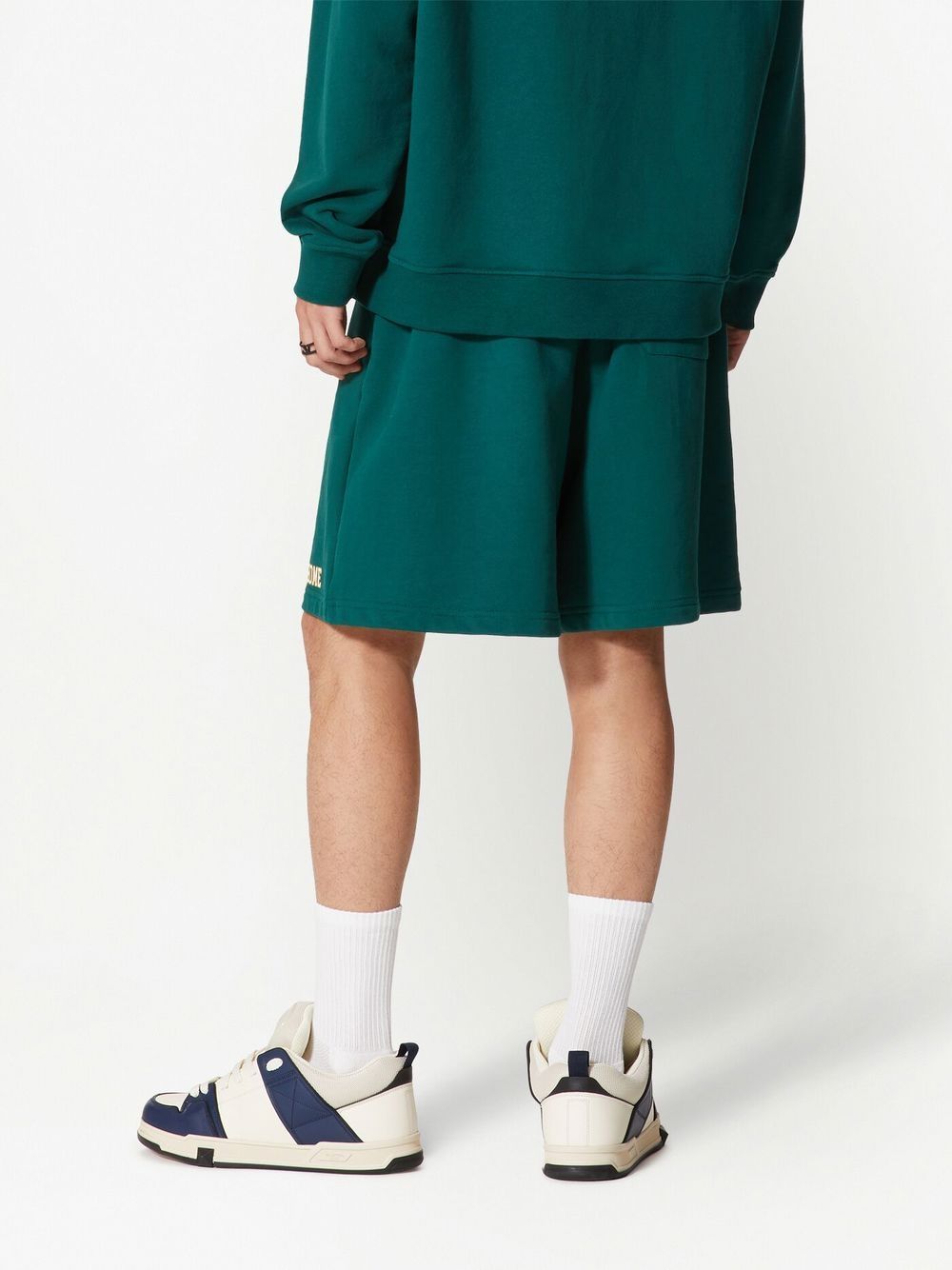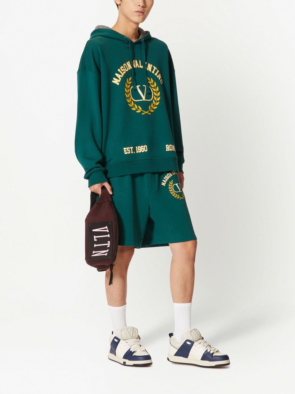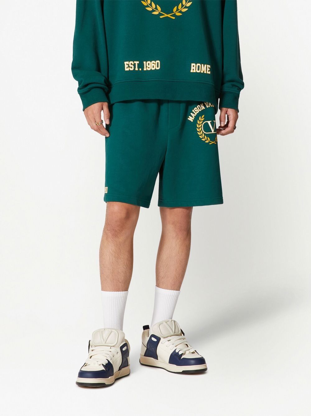VLogo Signature cotton shorts from VALENTINO featuring emerald green, cotton, fleece texture, logo print to the front, VLogo Signature, elasticated waistband, two side inset pockets and above-knee length.