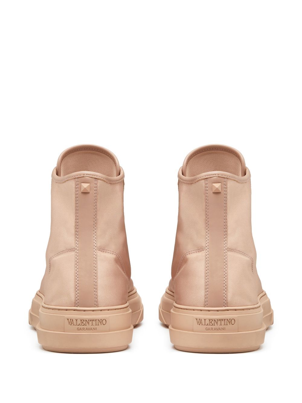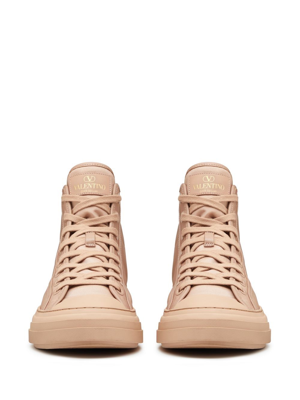 high-top lace-up sneakers from VALENTINO GARAVANI featuring sand beige, logo-print tongue, debossed logo to the rear, front lace-up fastening, rubber toecap, flat rubber sole and round toe.
