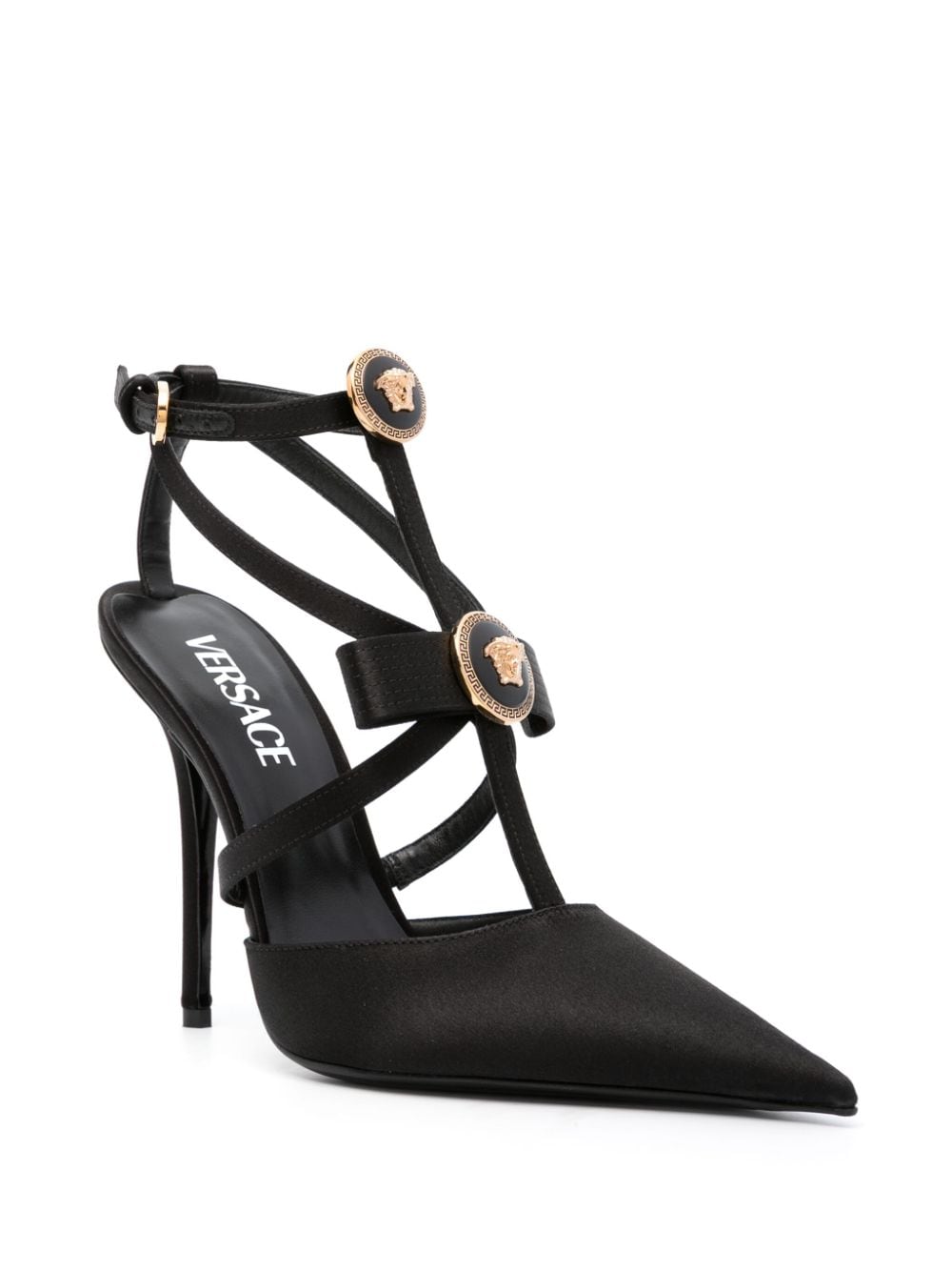 Gianni Ribbon Cage 110mm pumps from Versace featuring black, gold-tone, satin trim, Medusa plaque detail, bow detailing, pointed toe, buckle-fastening slingback strap, stiletto heel, branded leather insole and leather outsole.