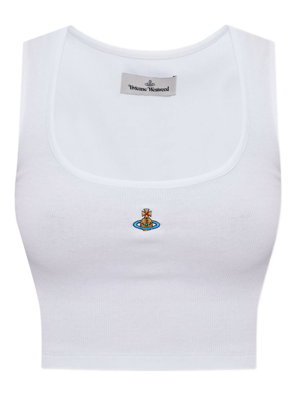 white ribbed texture sleeveless round neck cropped orb embroidery