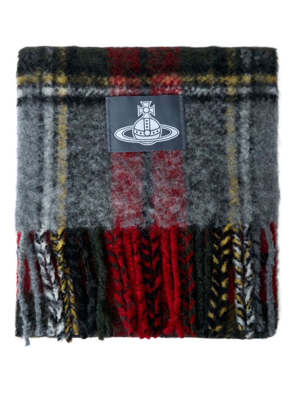 red wool blend plaid pattern fringed hem logo patch rectangle shape